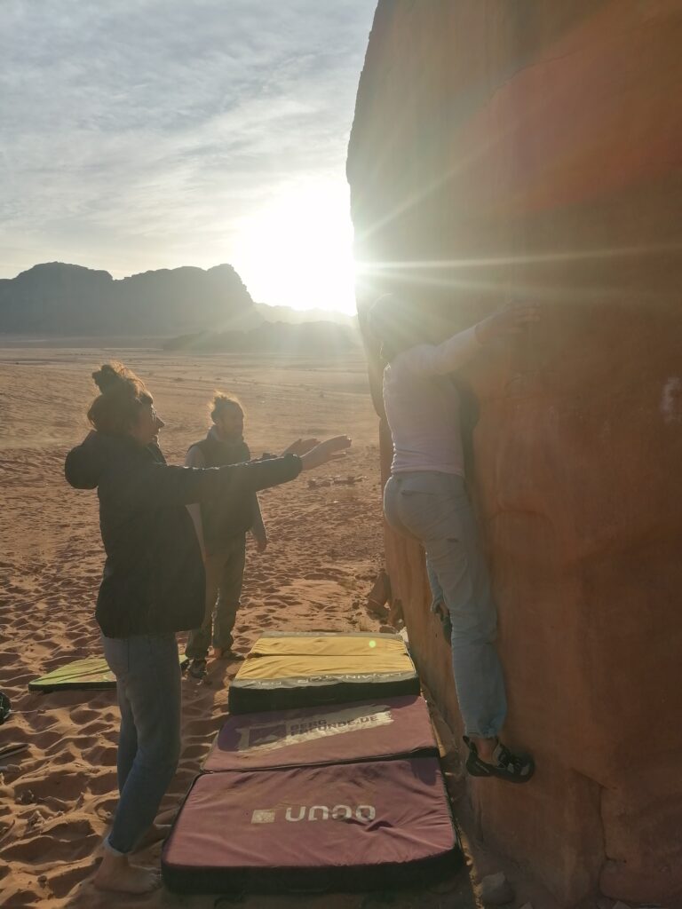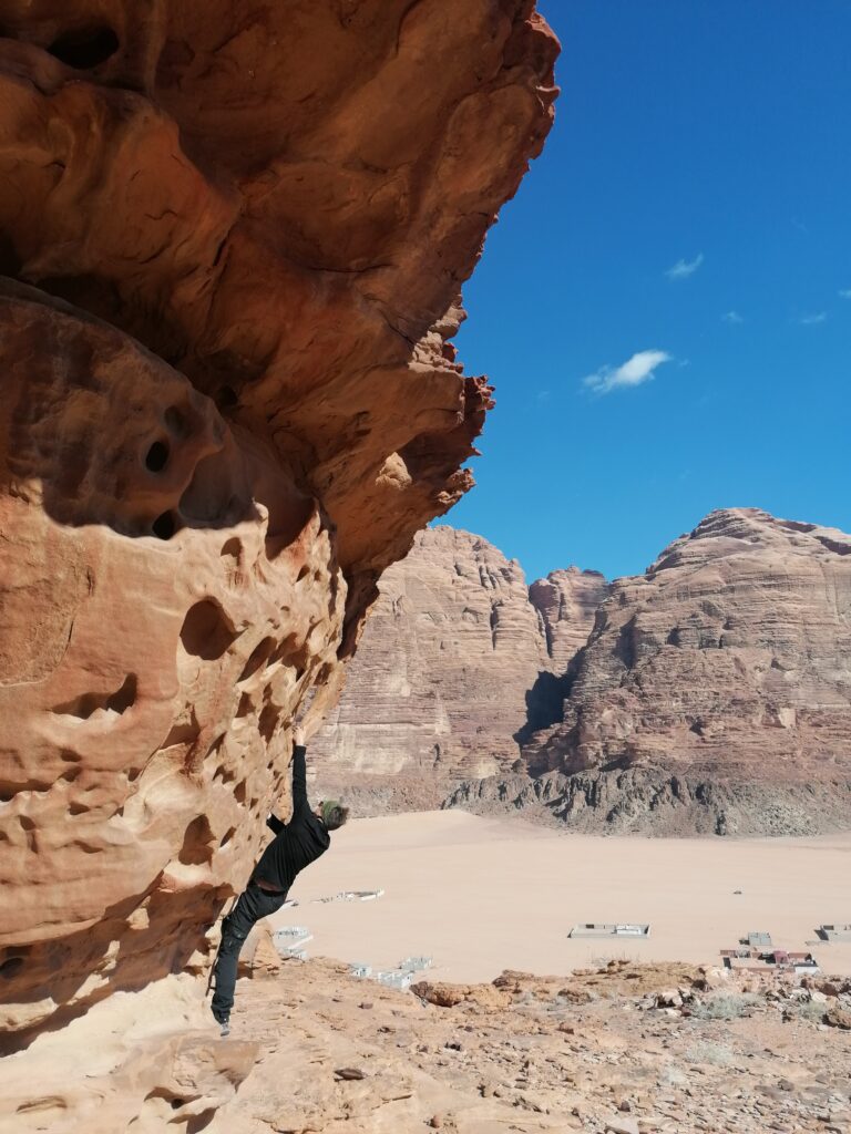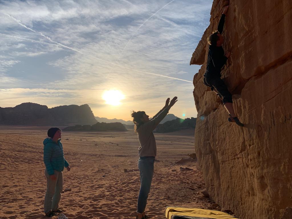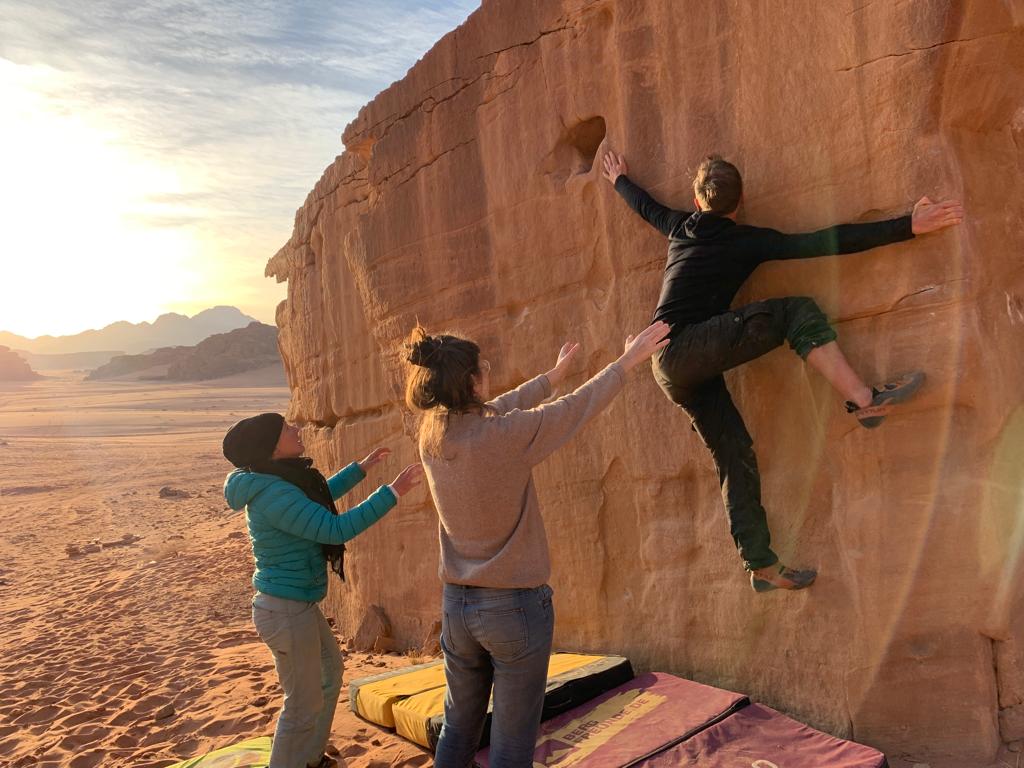 Im weiteren Tagesverlauf lernen wir noch Lou und Jonas kennen, zwei Deutsche, die wie wir im selbst umgebauten Van unterwegs sind, sogar in einem ziemlich ähnlichen Modell. Es stellt sich heraus, dass sie bereits 5 Monate in Jordanien unterwegs sind und das Spritproblem mit Additiven in den Griff bekommen hatten. Wir können es uns zwar nicht ganz erklären, aber dass ihr Auto das Ganze schon 5 Monate ausgehalten hat gibt uns Hoffnung, dass auch unser Ducato den Sprit ganz gut verträgt. Außerdem erzählen sie uns schwärmend von den Klettermöglichkeiten in Wadi Rum und bringen uns in ein moralisches Dilemma, da wir ja versprochen hatten unser Kletterequipment nicht zu verwenden. Zunächst können wir die Entscheidung aber verschieben, denn es geht erstmal Bouldern und man braucht eh kein Seil.