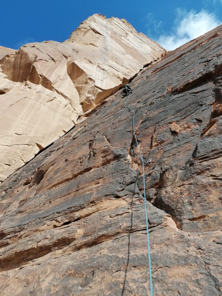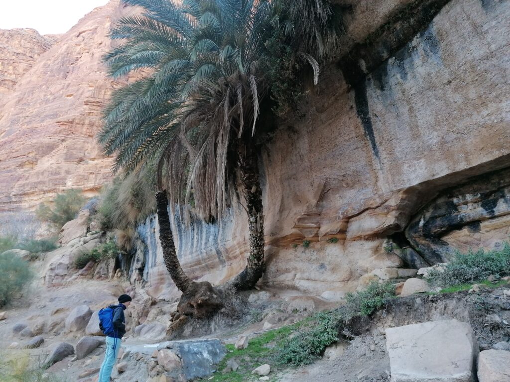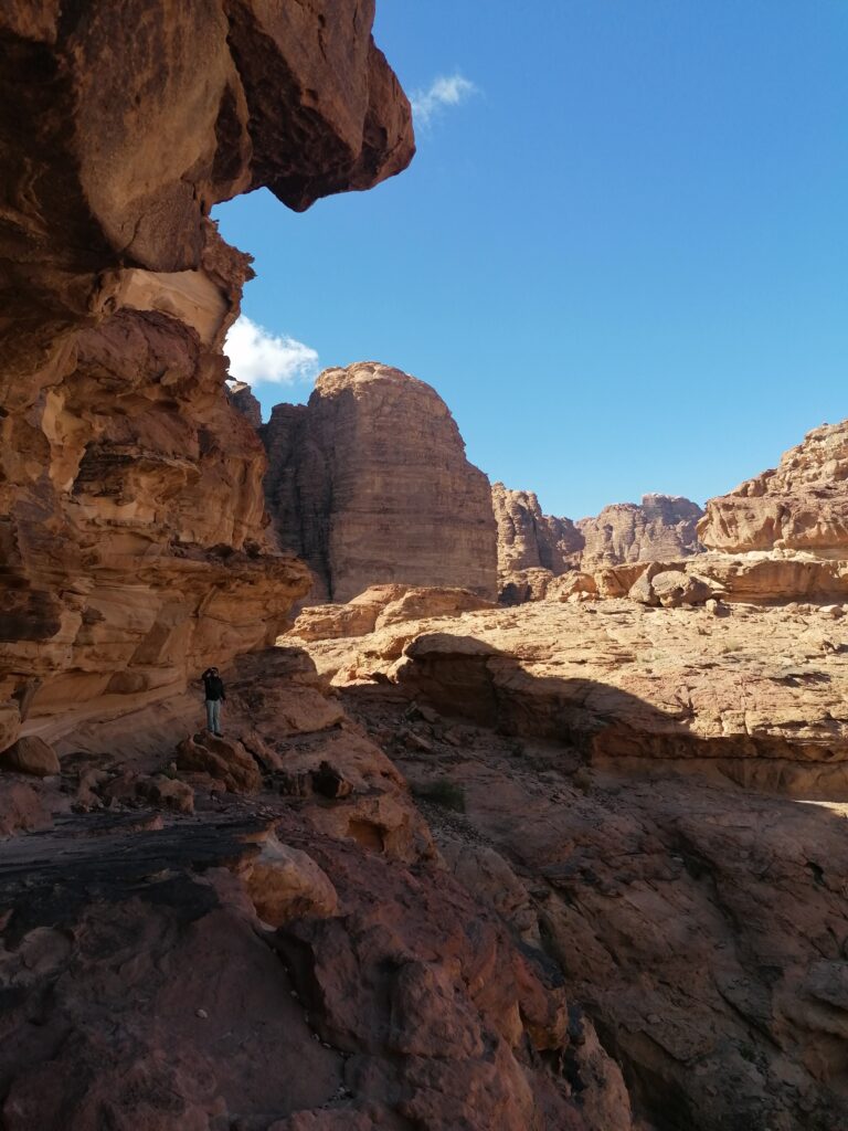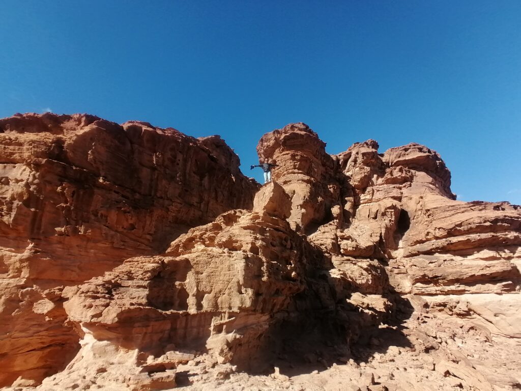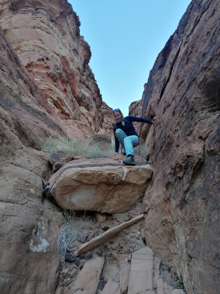 Im weiteren Tagesverlauf lernen wir noch Lou und Jonas kennen, zwei Deutsche, die wie wir im selbst umgebauten Van unterwegs sind, sogar in einem ziemlich ähnlichen Modell. Es stellt sich heraus, dass sie bereits 5 Monate in Jordanien unterwegs sind und das Spritproblem mit Additiven in den Griff bekommen hatten. Wir können es uns zwar nicht ganz erklären, aber dass ihr Auto das Ganze schon 5 Monate ausgehalten hat gibt uns Hoffnung, dass auch unser Ducato den Sprit ganz gut verträgt. Außerdem erzählen sie uns schwärmend von den Klettermöglichkeiten in Wadi Rum und bringen uns in ein moralisches Dilemma, da wir ja versprochen hatten unser Kletterequipment nicht zu verwenden. Zunächst können wir die Entscheidung aber verschieben, denn es geht erstmal Bouldern und man braucht eh kein Seil.