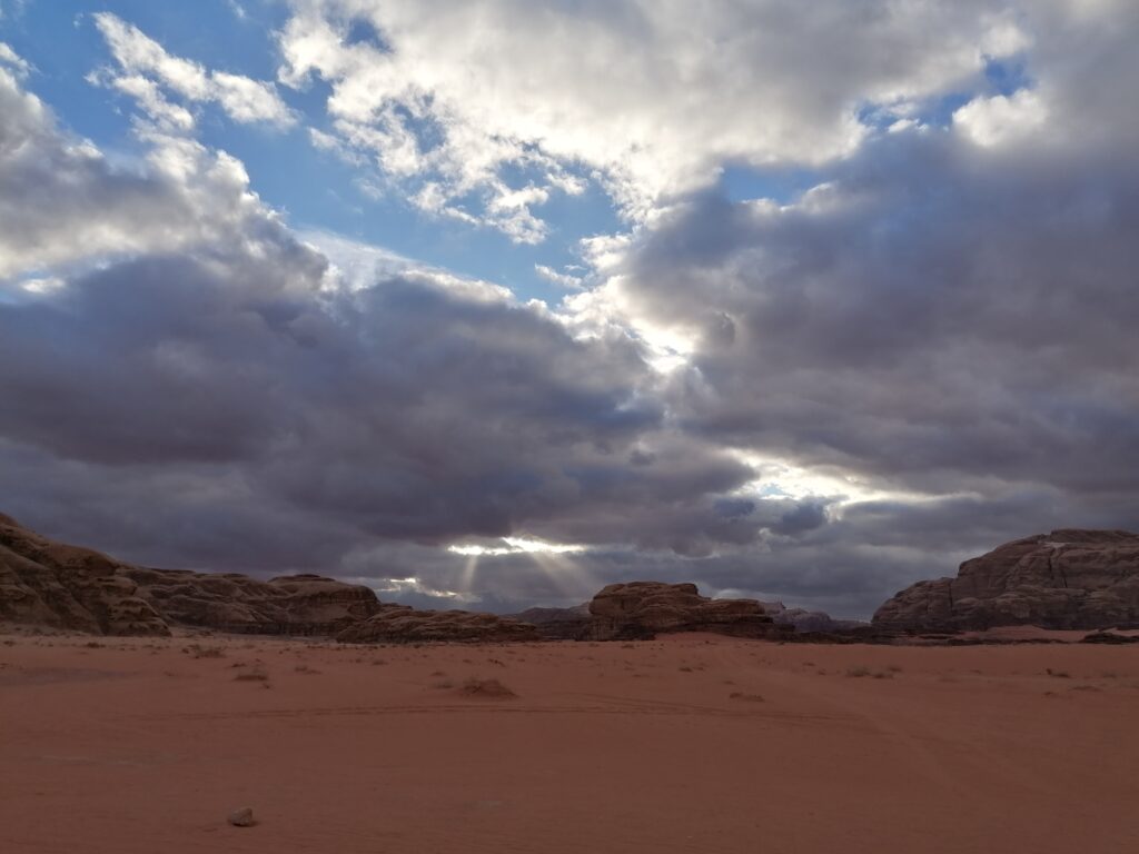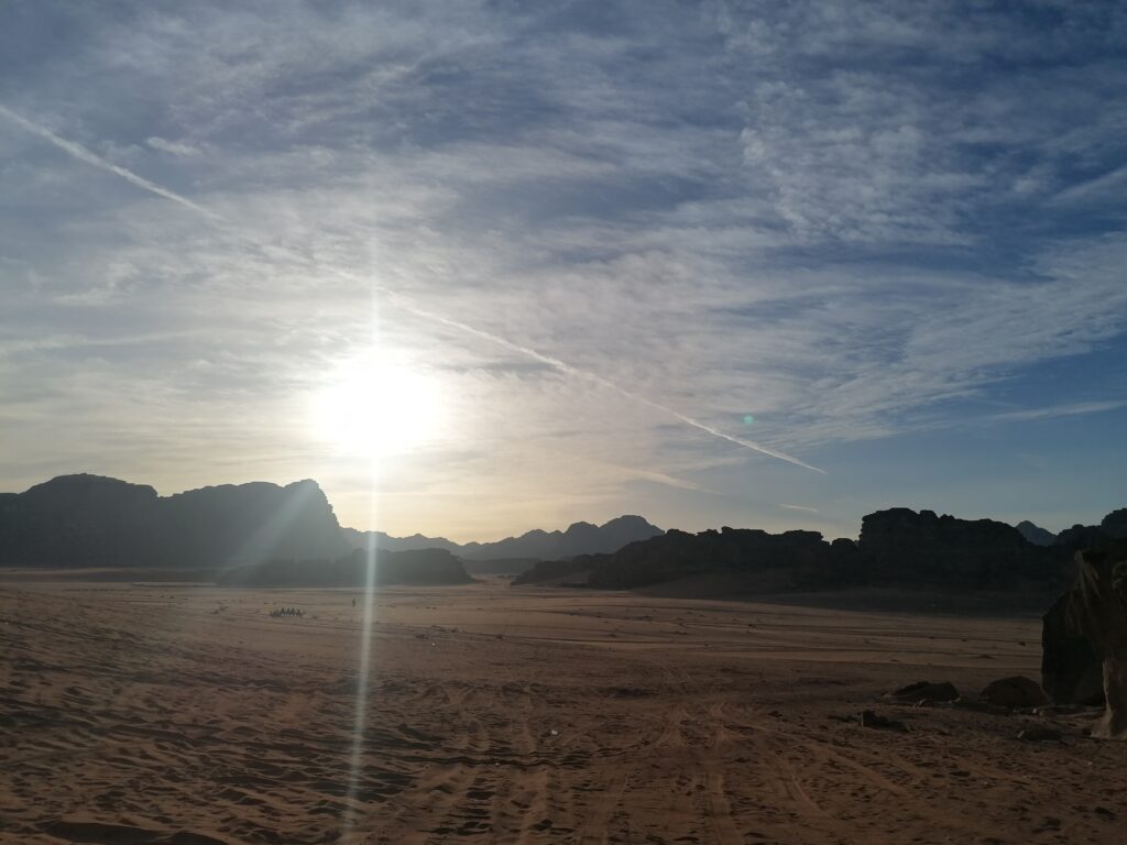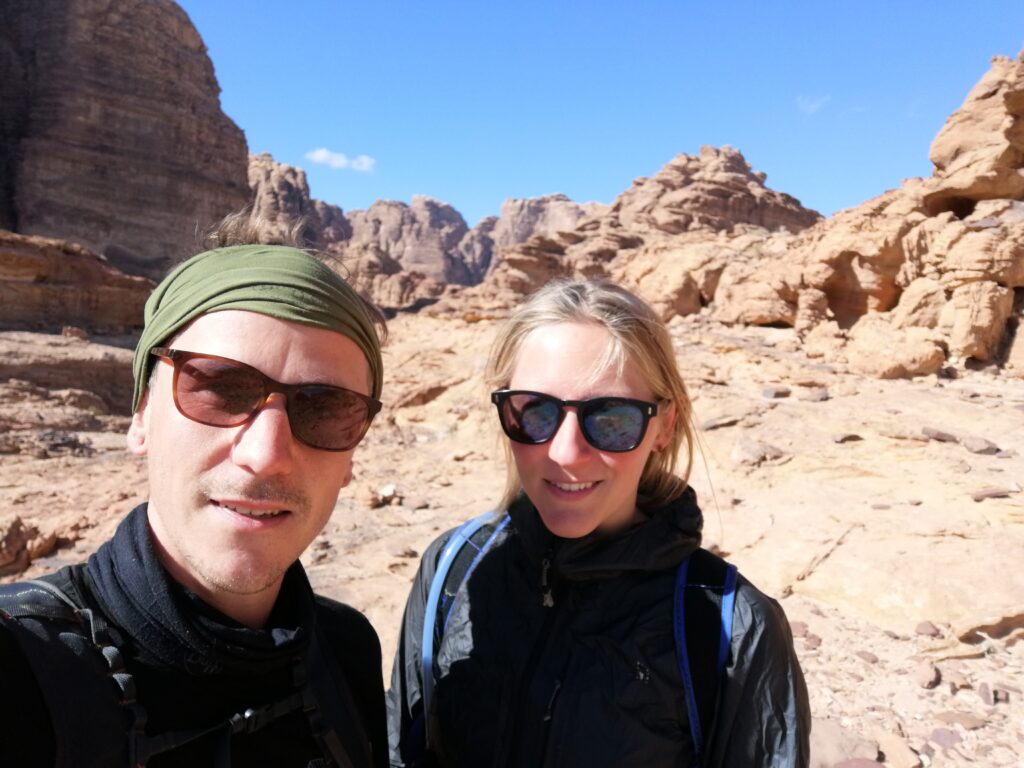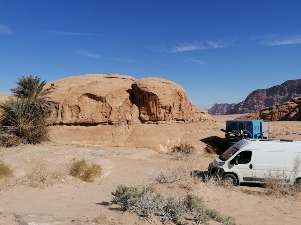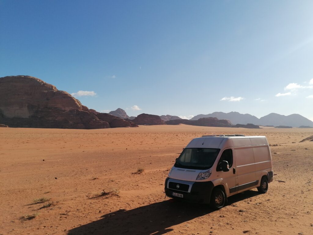 Am Folgetag bekommen wir weiteren Overlander-Besuch, Niko und Liz mit ihren drei Kindern, die wir während der Verschiffung kennengelernt hatten kommen uns im Wadi Rum Village besuchen. Nachdem wir alle gerne etwas Zeit in der “richtigen” Wüste verbringen würden, kommt die Idee auf, dass wir ja mit unserem Ducato auch in den National Park fahren könnten und falls wir stecken bleiben, können Liz und Niko uns herausziehen. Wir wollten eh alle mal unsere Abschleppausrüstung und Wüstenbleche ausprobieren.