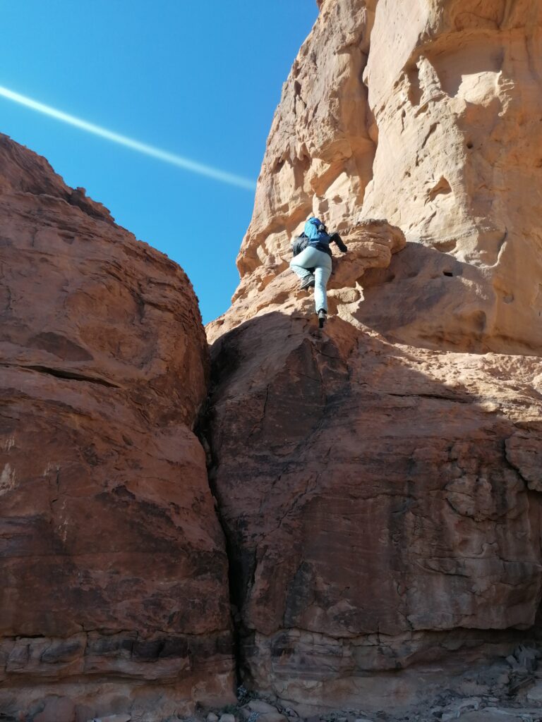 Für uns ist das eine gute Gelegenheit, mal die Grenzen von unserm Fahrzeug auszutesten. Leider sind die schneller erreicht als gedacht. Nach nur 10 min Fahrt haben wir uns das erste Mal eingegraben. Wir bekommen reichlich Tipps von vorbeifahrenden Beduinen und lassen noch mehr Luft aus den Reifen. Außerdem zeigt sich, dass vor allem eins hilft: Mehr Gas. Also eine höhere Geschwindigkeit halten um über die sandigen Stellen zu kommen. Damit klappt das Fahren dann deutlich besser. Leider gibt es auch felschottrige Stellen über die man eher langsam fahren sollte und manchmal sind die Fahrgräben so tief, dass wir leicht aufsetzen. Insgesamt also eine ziemliche Tortur für LIAA und wir müssen fast 10 mal rausgezogen werden und nach der Fahrt erstmal unsere Inneneinrichtung wieder zusammen sammeln. Letztendlich schaffen wir es aber eine nette Stelle in der Wüste zu finden, an der wir unser Camp aufschlagen können. Wie es der Zufall will, ist das auch nicht weit von einem Sportklettergebiet entfernt.