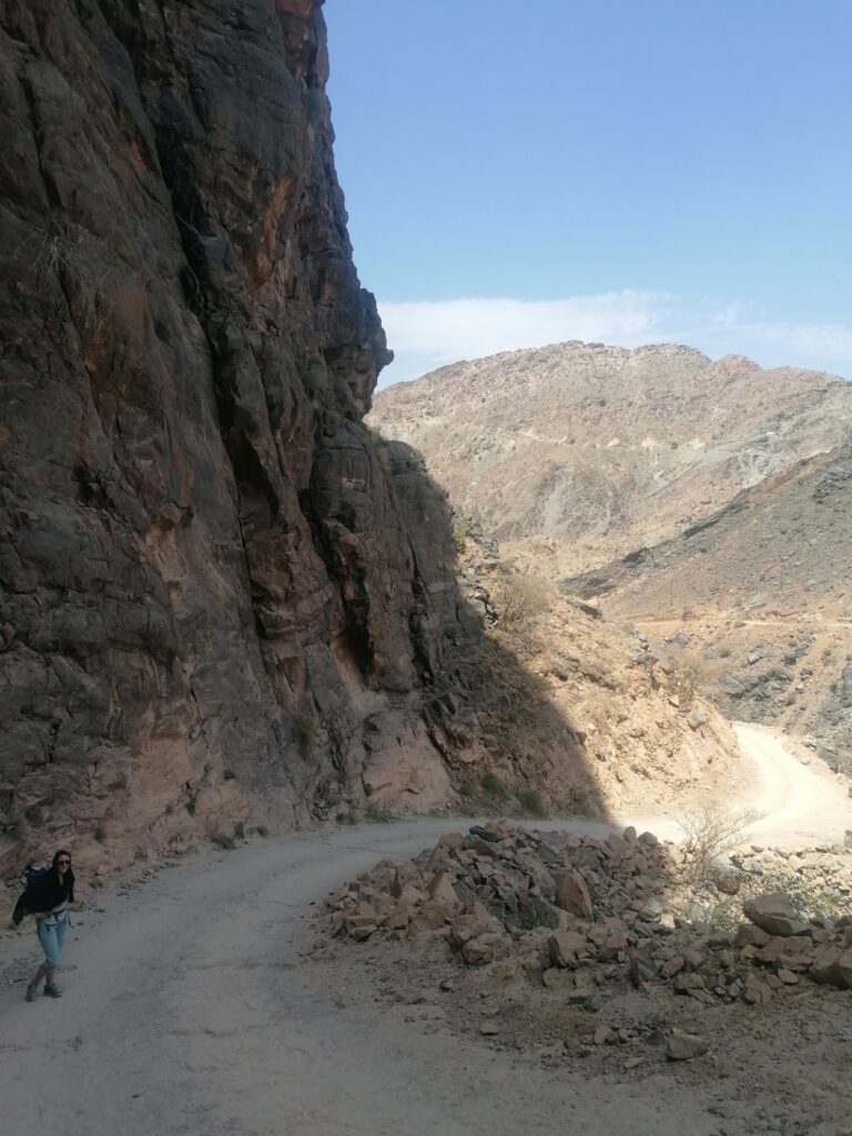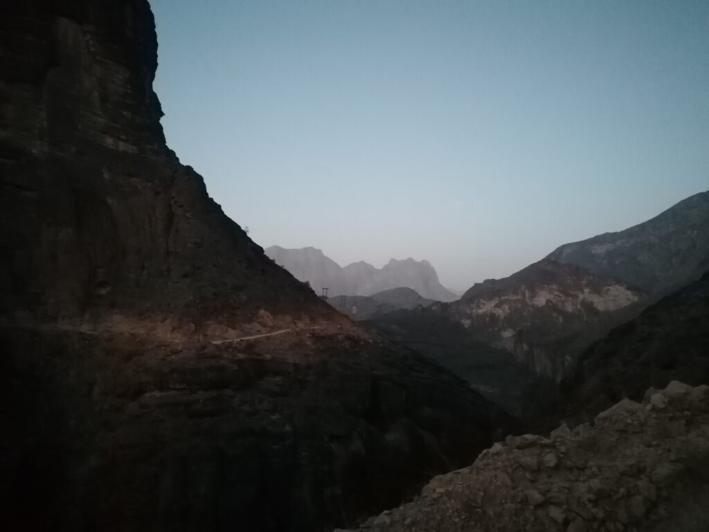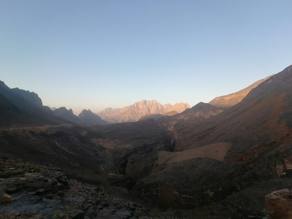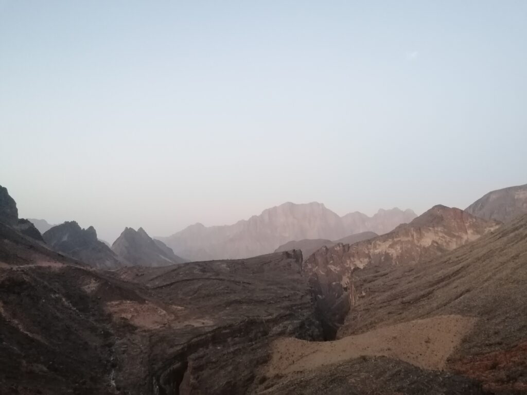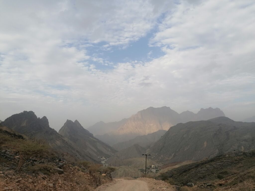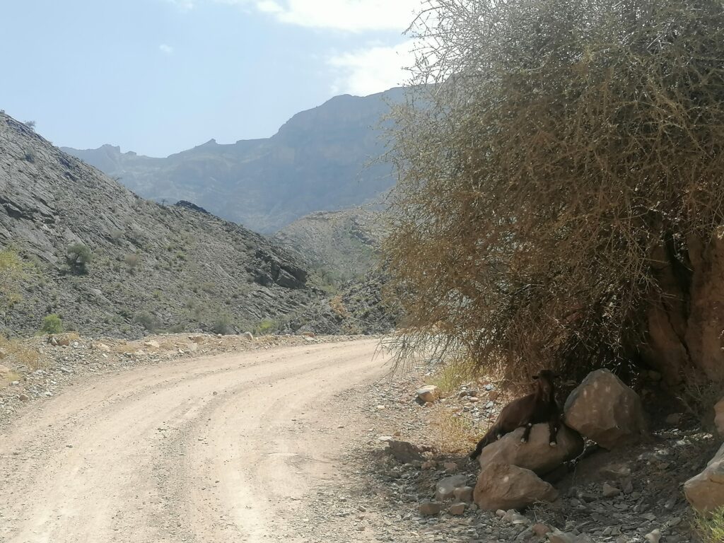 Immer weiter hinab um unglaubliche enge und steile Serpentinen, wie man sie in Europa nirgends findet. Auf einer Schotterpiste, die zeitweise in reinen Fels überging. Manche Streckenabschnitte waren so schmal und schräg, dass Julie sich in die Mitte des Fahrzeugs lehnte aus Angst es würde über die Seite den Abhang hinabkippen. Die unglaublich tollen Aussichten über das Hajar Gebirge konnten wir aufgrund des Adrenalins kaum genießen. Immer mal wieder hielten wir an an um die Straße vorher abzulaufen. Teilweise blieb das Fahrzeug dabei nur mit eingelegtem Rückwärtsgang plus voll angezogener Handbremse an Ort und Stelle. Immer mal wieder ließen wir auch etwas Unterboden und Auspuff am Straßenbelag zurück, wenn eine Kante doch zu steil gewesen war.