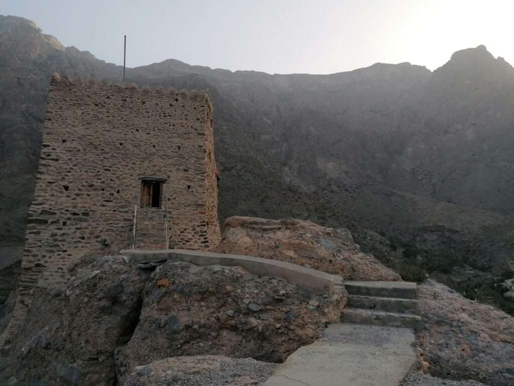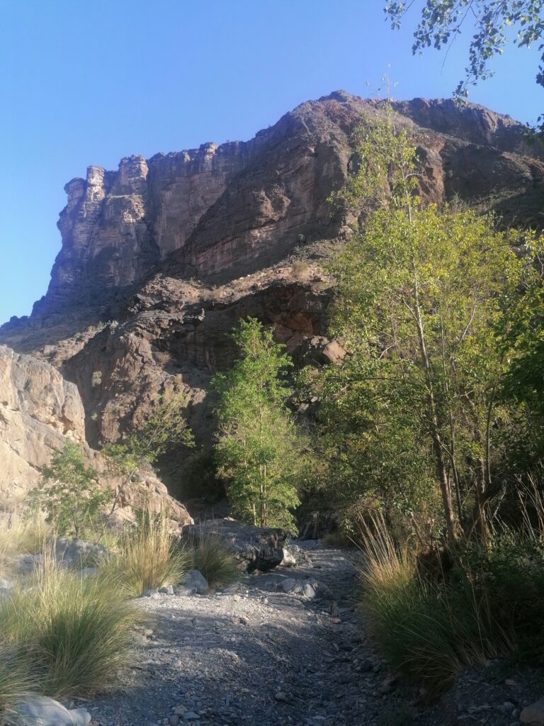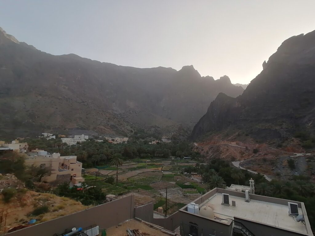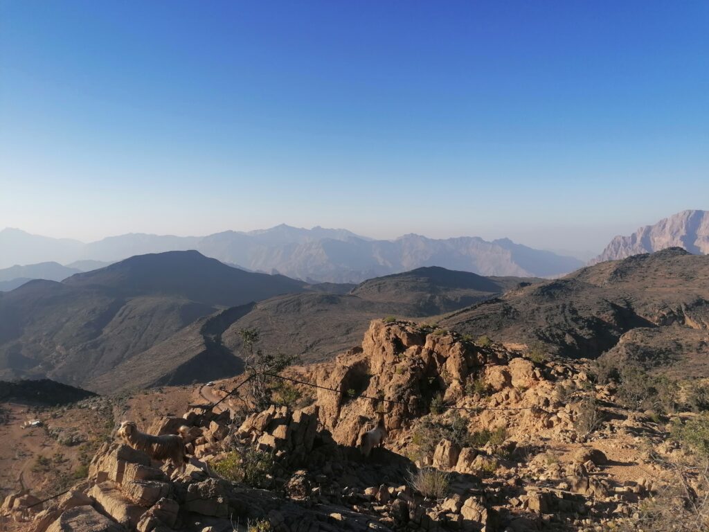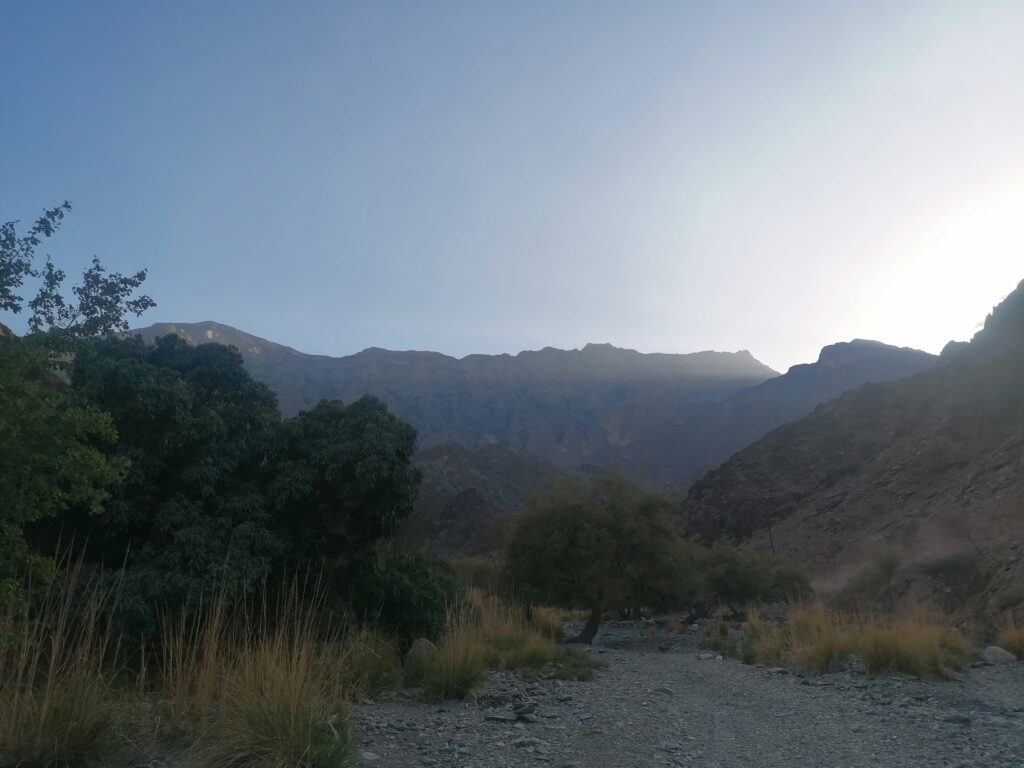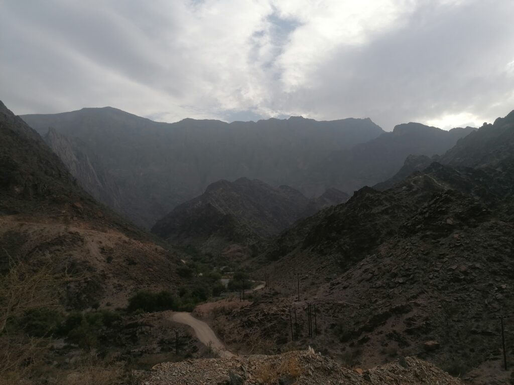 Immer weiter hinab um unglaubliche enge und steile Serpentinen, wie man sie in Europa nirgends findet. Auf einer Schotterpiste, die zeitweise in reinen Fels überging. Manche Streckenabschnitte waren so schmal und schräg, dass Julie sich in die Mitte des Fahrzeugs lehnte aus Angst es würde über die Seite den Abhang hinabkippen. Die unglaublich tollen Aussichten über das Hajar Gebirge konnten wir aufgrund des Adrenalins kaum genießen. Immer mal wieder hielten wir an an um die Straße vorher abzulaufen. Teilweise blieb das Fahrzeug dabei nur mit eingelegtem Rückwärtsgang plus voll angezogener Handbremse an Ort und Stelle. Immer mal wieder ließen wir auch etwas Unterboden und Auspuff am Straßenbelag zurück, wenn eine Kante doch zu steil gewesen war.