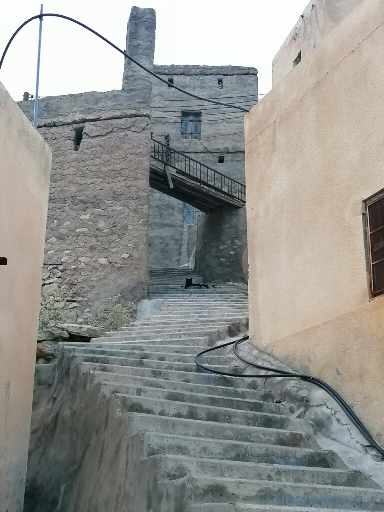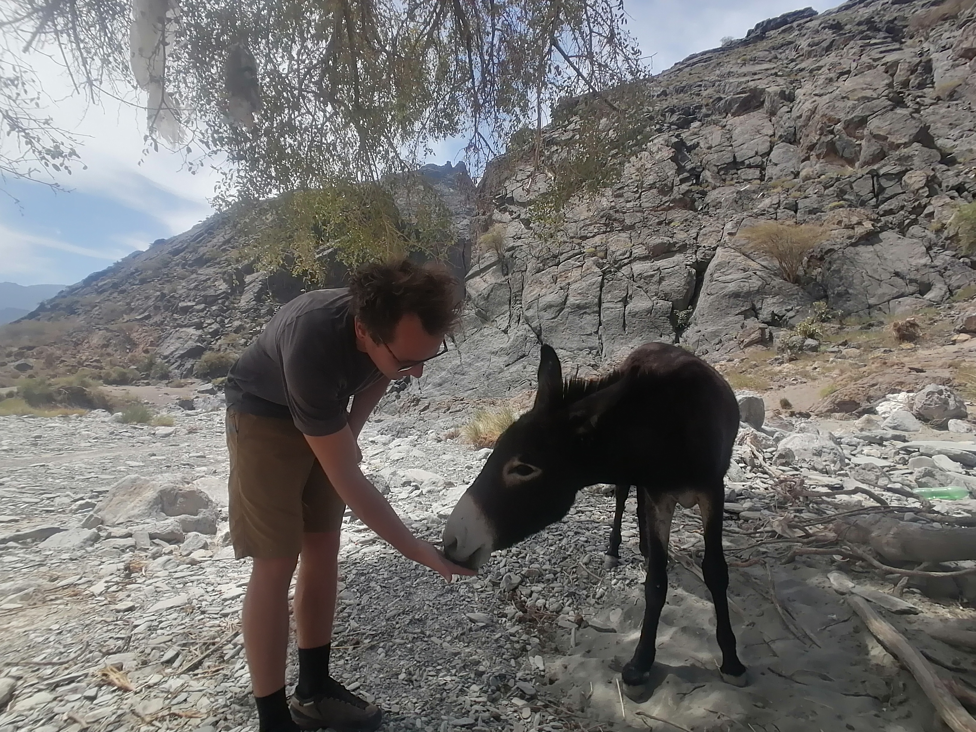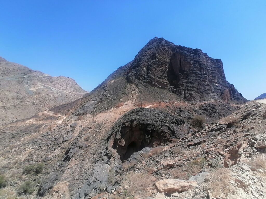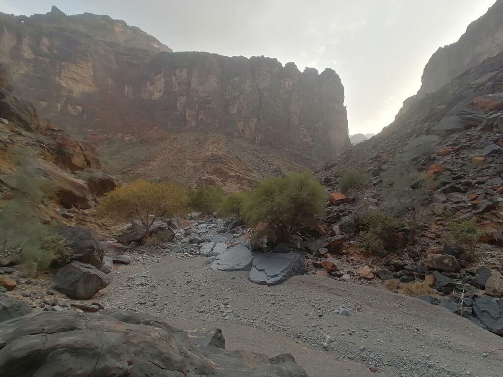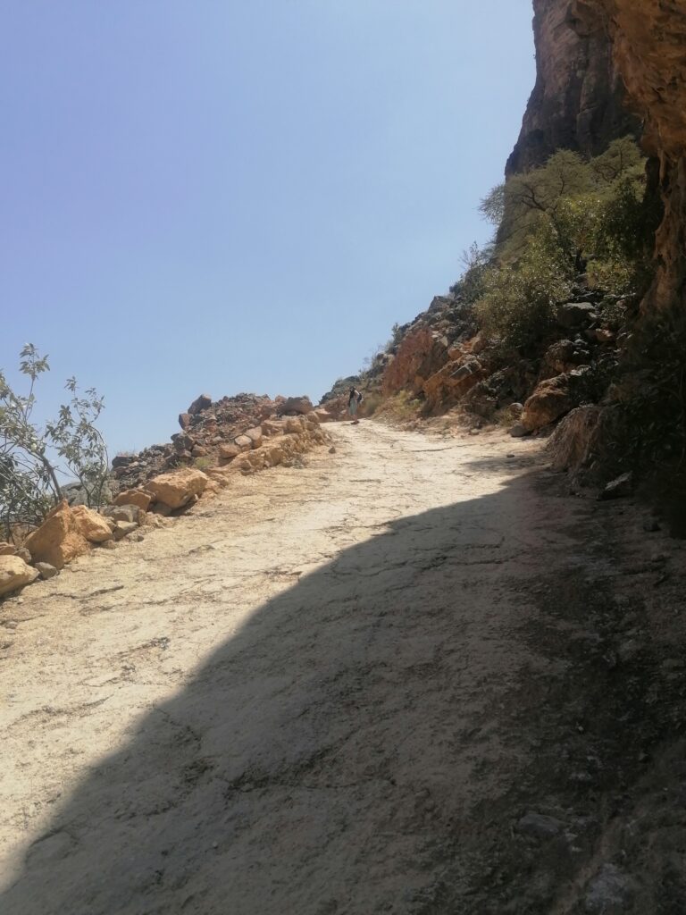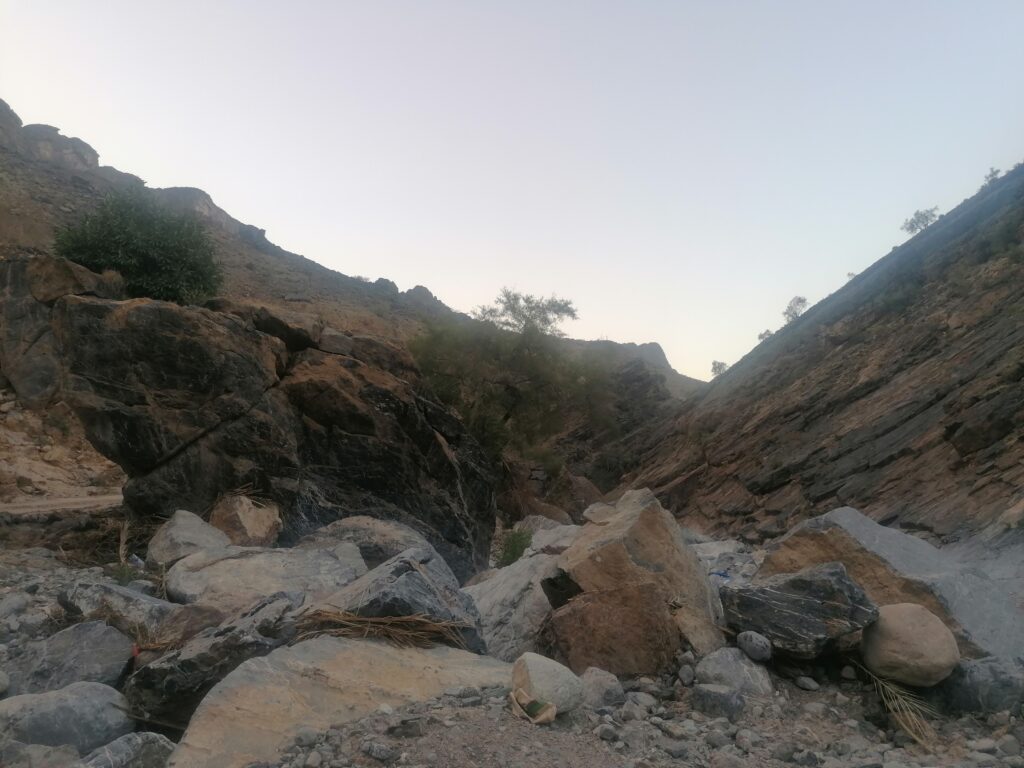 Immer weiter hinab um unglaubliche enge und steile Serpentinen, wie man sie in Europa nirgends findet. Auf einer Schotterpiste, die zeitweise in reinen Fels überging. Manche Streckenabschnitte waren so schmal und schräg, dass Julie sich in die Mitte des Fahrzeugs lehnte aus Angst es würde über die Seite den Abhang hinabkippen. Die unglaublich tollen Aussichten über das Hajar Gebirge konnten wir aufgrund des Adrenalins kaum genießen. Immer mal wieder hielten wir an an um die Straße vorher abzulaufen. Teilweise blieb das Fahrzeug dabei nur mit eingelegtem Rückwärtsgang plus voll angezogener Handbremse an Ort und Stelle. Immer mal wieder ließen wir auch etwas Unterboden und Auspuff am Straßenbelag zurück, wenn eine Kante doch zu steil gewesen war.