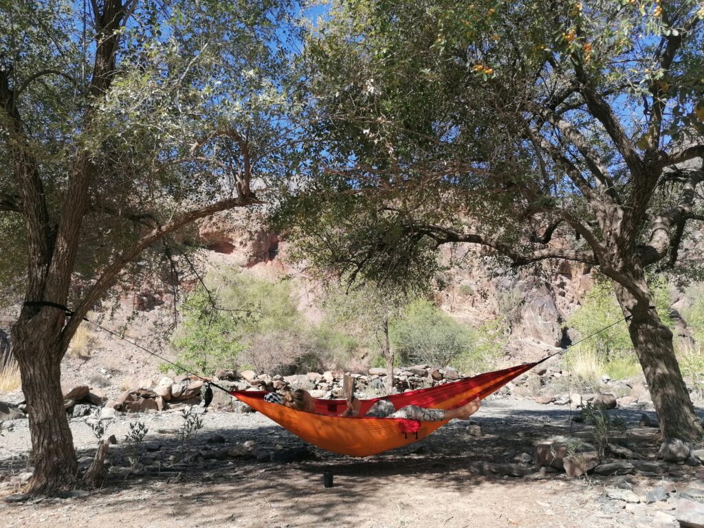 Wie zur Hölle sollen wir hier wieder rauskommen, wenn selbst bei dieser vergleichsweisen geringen Steigung die Reifen durchdrehen? denke ich mir und stelle mir alle möglichen Horrorszenarien vor als es um uns rum immer dunkler wird. Wir müssen wie schon zuvor immer mal wieder Gegenverkehr ausweichen. Die Blicke, die uns dabei von den Familien der Einheimischen aus den vollbesetzten Geländejeeps erreichen wissen wir nicht so recht zu deuten, aber sie grüßen immer ziemlich freundlich. Keiner bestürmt uns mit der Frage, was wir hier eigentlich machen, was wir zumindest mal als ein positives Zeichen werten. Vielleicht ist es aber auch einfach nur Höflichkeit. Wir wollen noch weiter bis zu einer Stelle, bei der wir übernachten können um wenigstens das Tageslicht auf unserer Seite zu haben. Auch sehen die Steigungen bei Dunkelheit noch gruseliger aus. Es kommen wieder extrem steile Stellen. Wir laden die Wasserkanister nochmals aus aus Angst zu schwer / zu schnell zu sein. Ich will beim Anfahren auf keinen Fall zu viel Gas geben aber auch mit eingelegtem ersten Gang die Motorbremse mitnutzen und so würge ich vor der Kante den Motor noch drei Mal ab. Wir haben beide richtig Schiss kommen jedoch abermals heil weiter unten an. Nach einigen weiteren Serpentinen erreichen wir dann doch noch einen netten Stellplatz an einem Flußbett unlängst von unserem Ziel, wo wir die Nacht verbringen wollen. Hier gibt es sogar gutes Internet und so hoffen wir etwas aufgemuntert, dass wir schon noch irgendwie einen Weg heraus finden würden.