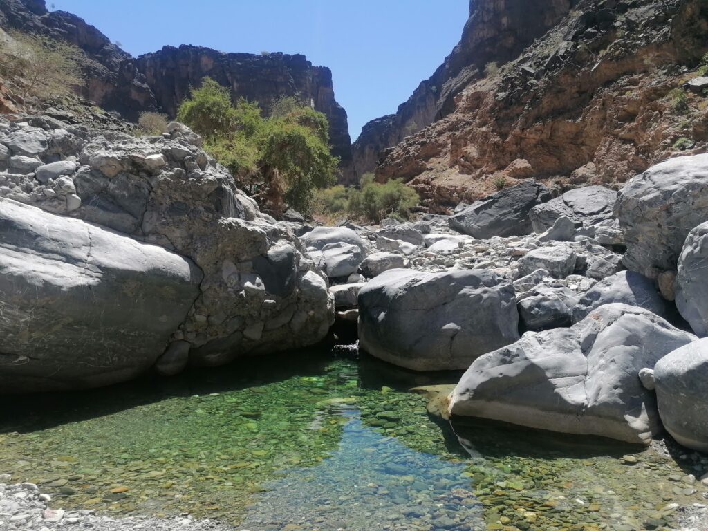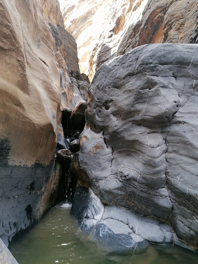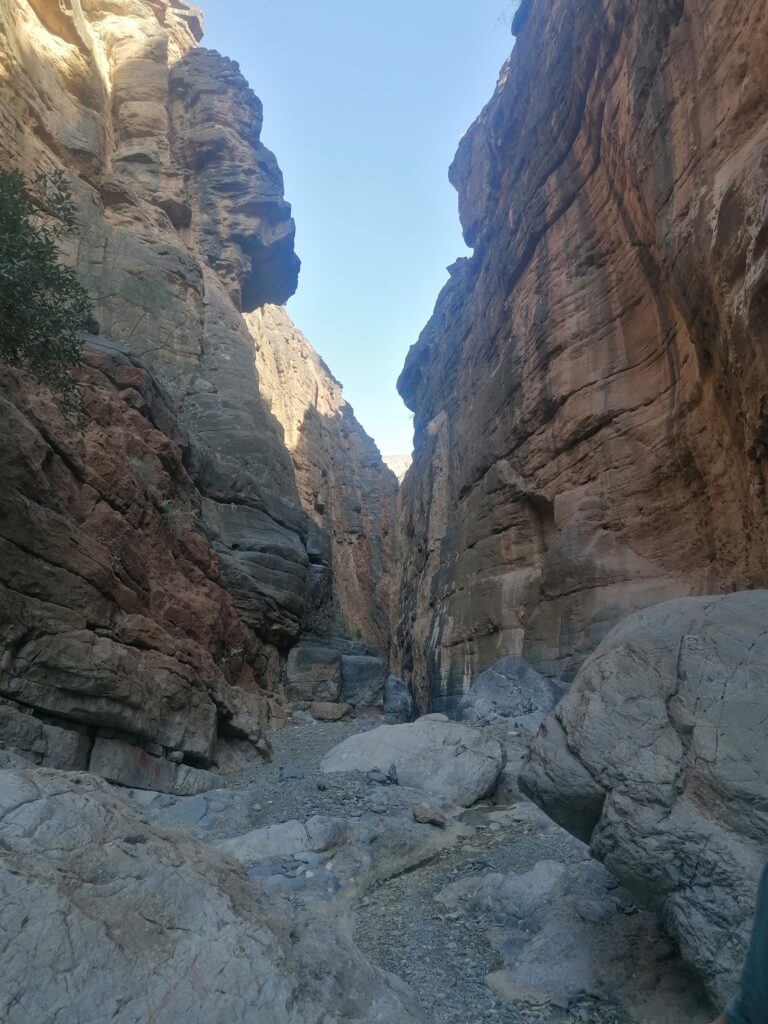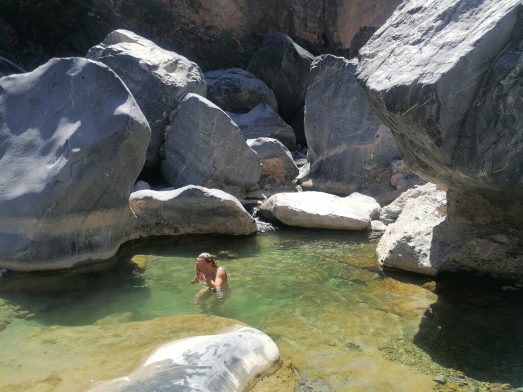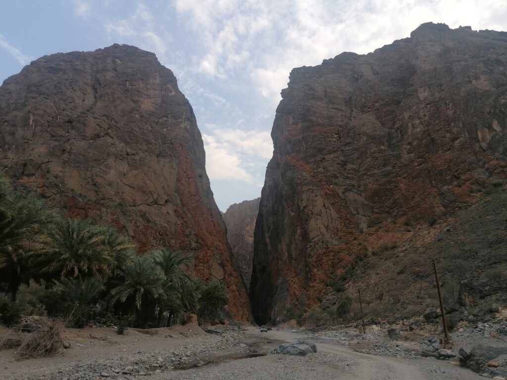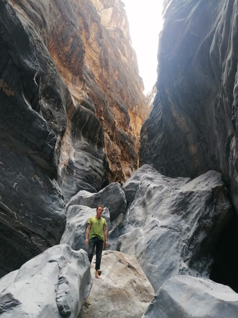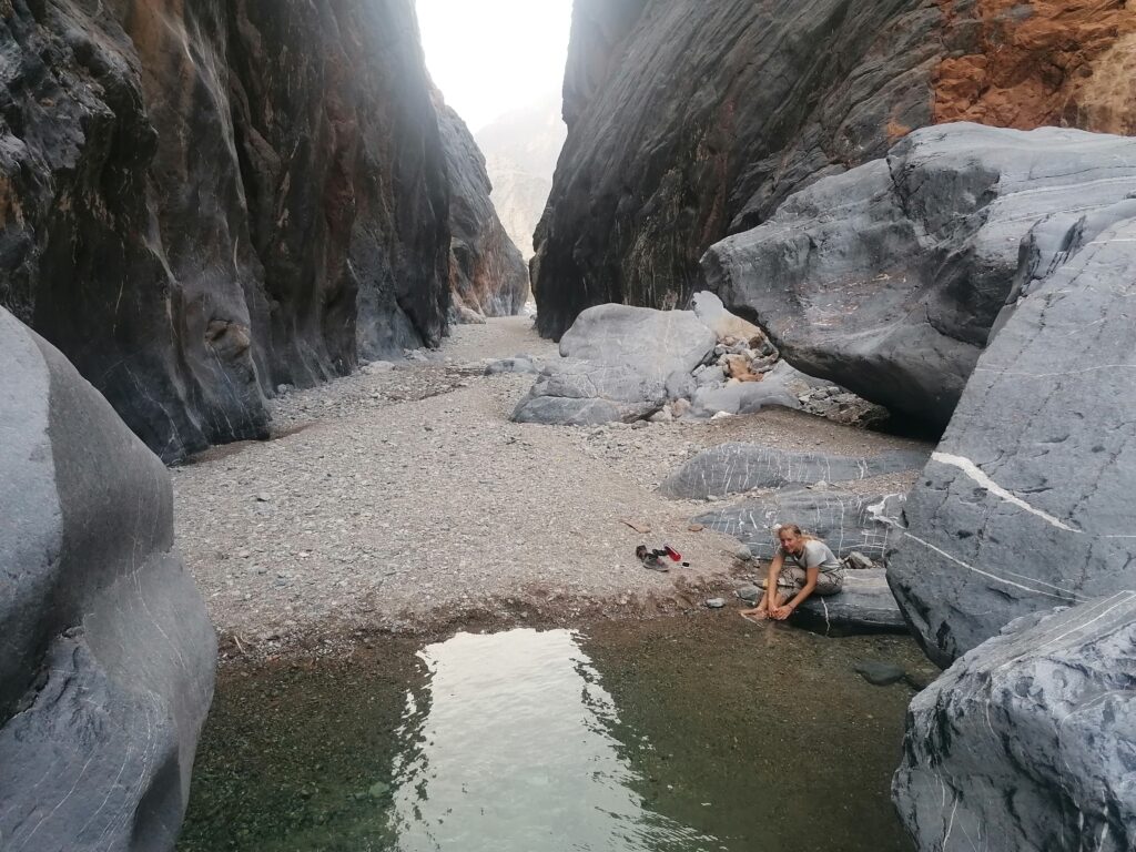 Wir verbringen einige Tage am Snake Canyon und erkunden diesen von allen Seiten, gehen Klettern und entdecken das kleine malerische Gebirgsdorf Badi Seet, das inmitten der kargen Landschaft eine grüne Oase bildet. Für Erfrischung sorgen enge Felsschluchten mit kühlen Wasserfällen und natürlichen Becken. Alles in allem ist das Gebiet einer der Höhepunkte unserer Oman Reise und wenn wir nun feststecken würden, hätte es sich wohl auch gelohnt.