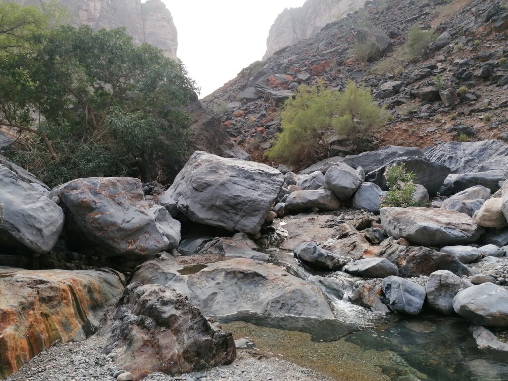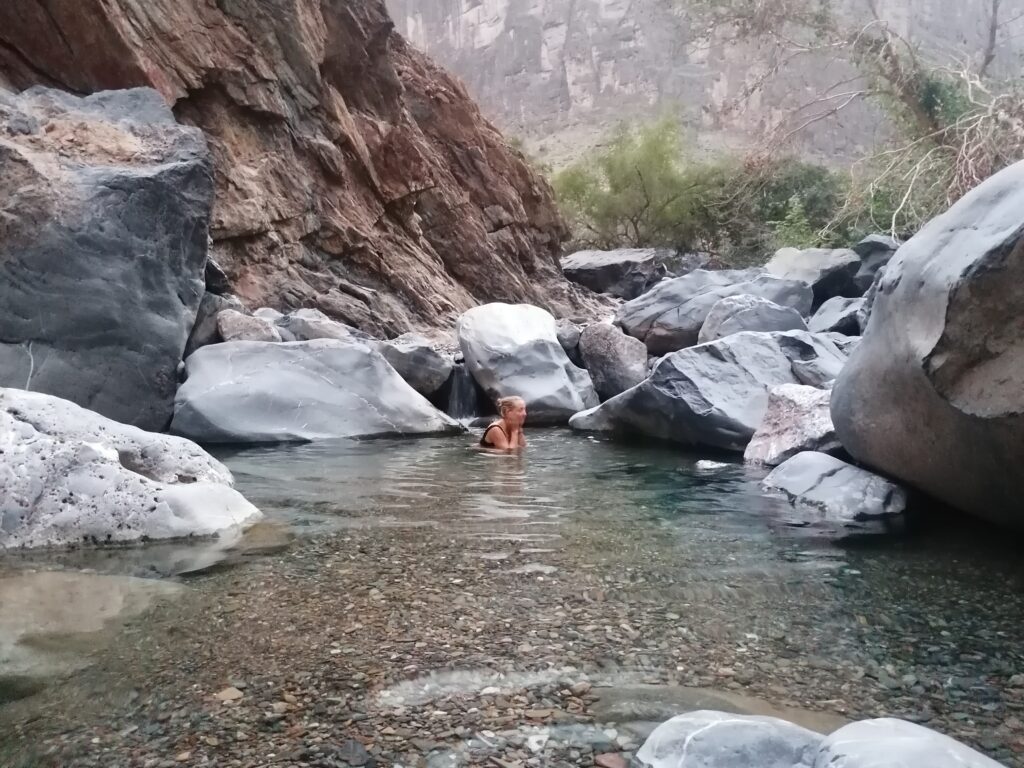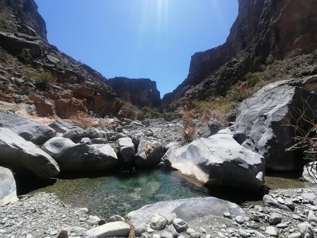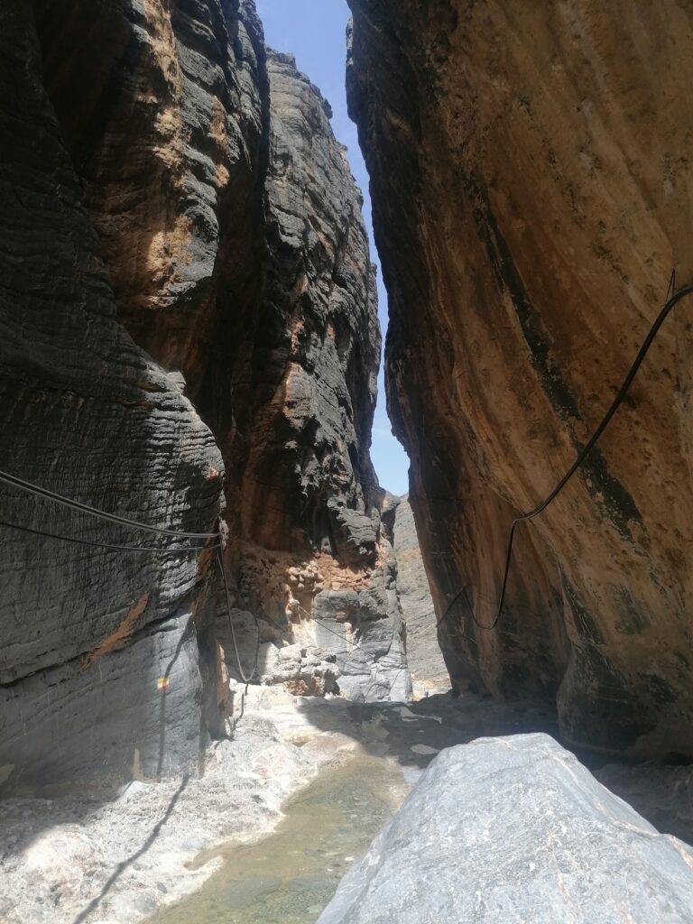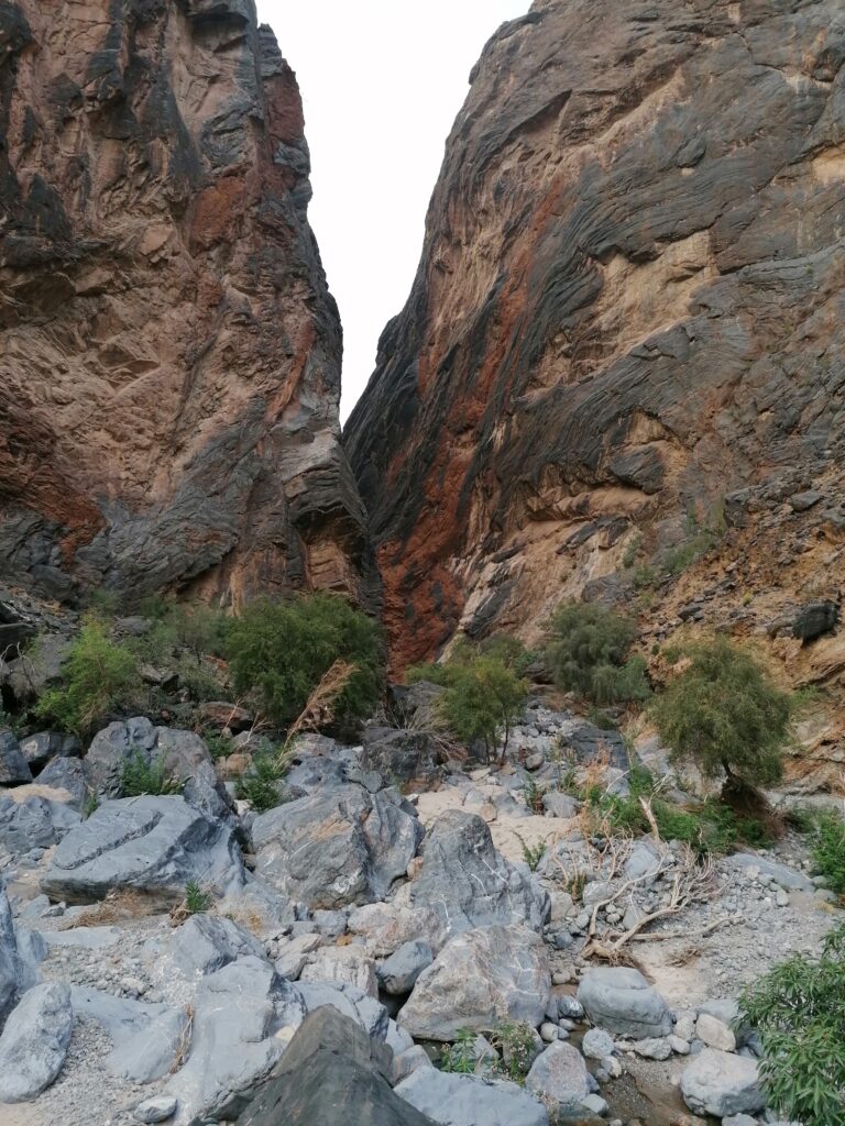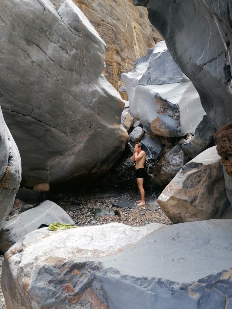Wir verbringen einige Tage am Snake Canyon und erkunden diesen von allen Seiten, gehen Klettern und entdecken das kleine malerische Gebirgsdorf Badi Seet, das inmitten der kargen Landschaft eine grüne Oase bildet. Für Erfrischung sorgen enge Felsschluchten mit kühlen Wasserfällen und natürlichen Becken. Alles in allem ist das Gebiet einer der Höhepunkte unserer Oman Reise und wenn wir nun feststecken würden, hätte es sich wohl auch gelohnt.
