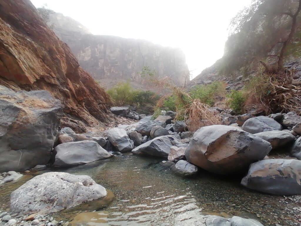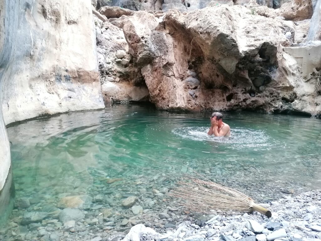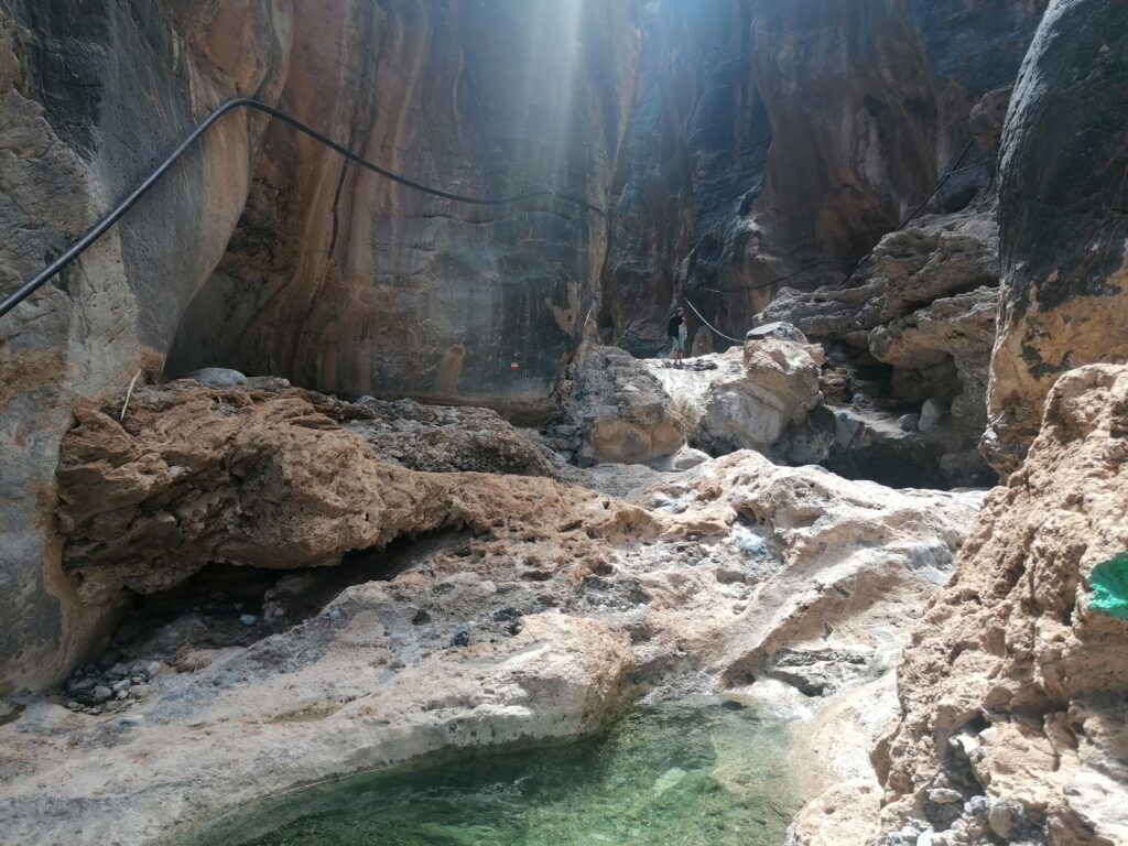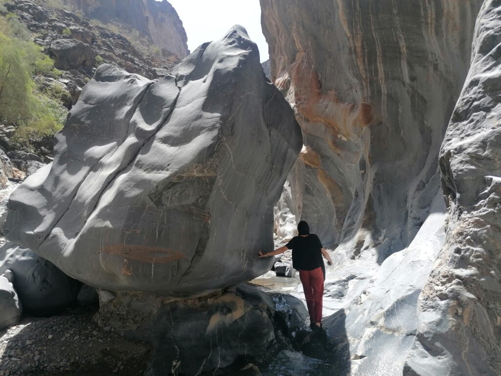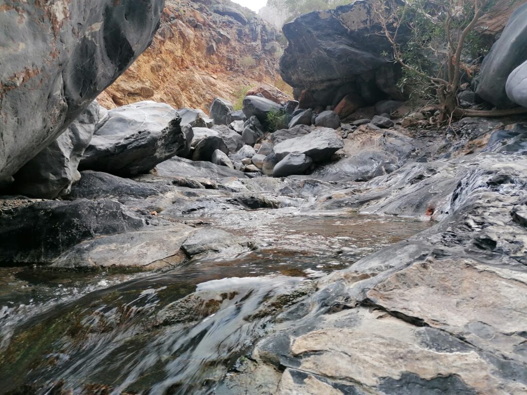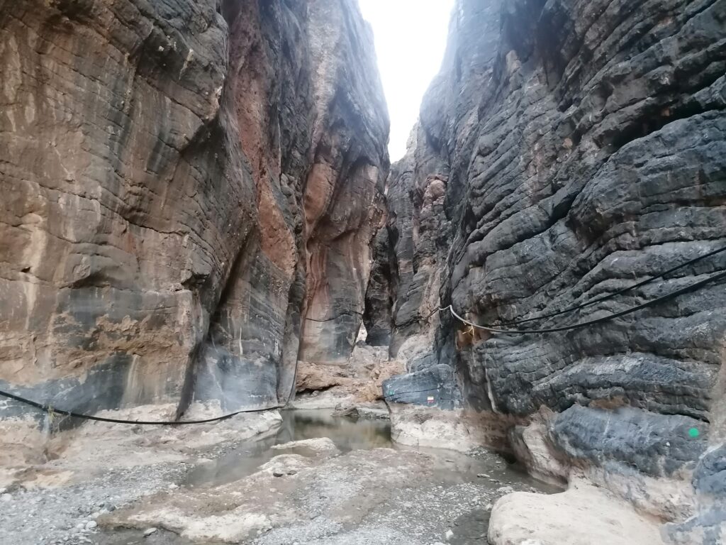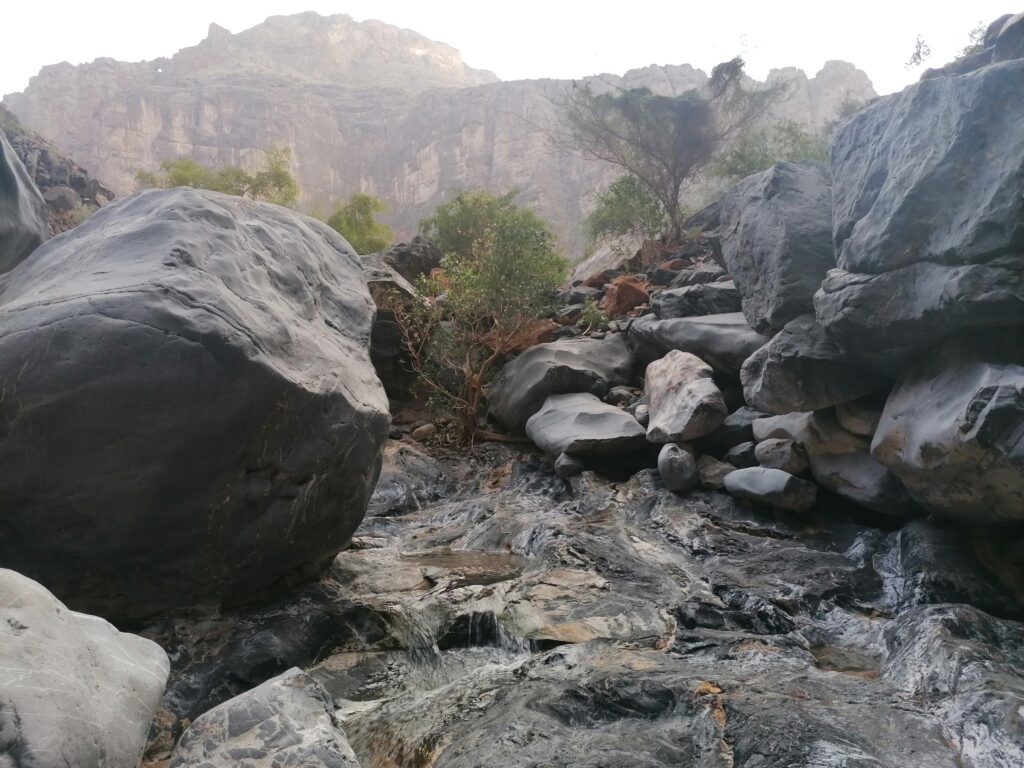 Wir verbringen einige Tage am Snake Canyon und erkunden diesen von allen Seiten, gehen Klettern und entdecken das kleine malerische Gebirgsdorf Badi Seet, das inmitten der kargen Landschaft eine grüne Oase bildet. Für Erfrischung sorgen enge Felsschluchten mit kühlen Wasserfällen und natürlichen Becken. Alles in allem ist das Gebiet einer der Höhepunkte unserer Oman Reise und wenn wir nun feststecken würden, hätte es sich wohl auch gelohnt.