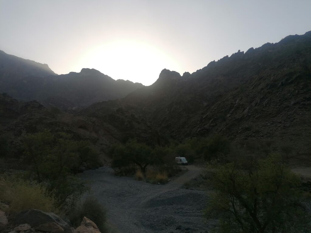 Ich drücke das Gaspedal auf Anschlag durch doch der Van bleibt auf der Stelle. “Du gräbst dich ein” gibt Julie das Offensichtliche zu Bedenken. Ich lasse uns rückwärts wieder die steile Piste hinabrollen. Glücklicherweise gibt es bei der letzten Kehre so etwas wie eine Anlaufbahn an der wohl schon andere Fahrzeuge ausgeholt hatten. Julie nimmt die vollen Wasserkanister und steigt aus, geht die Straße etwas hinauf um zu schauen wie es weitergeht. “Hier oben ist es wohl weniger steil” höre ich und starte den zweiten Versuch etwas leichter und mit mehr Anlauf. Dass wir dieses Mal drüber kommen verhindert nicht, dass mein Herz immer weiter in die Hose sackt. Es ist schon inmitten der Dämmerung und wir sind immer noch irgendwo im Hajar-Gebirge auf einer unglaublich steilen und gewundenen Schotterpiste unterwegs.