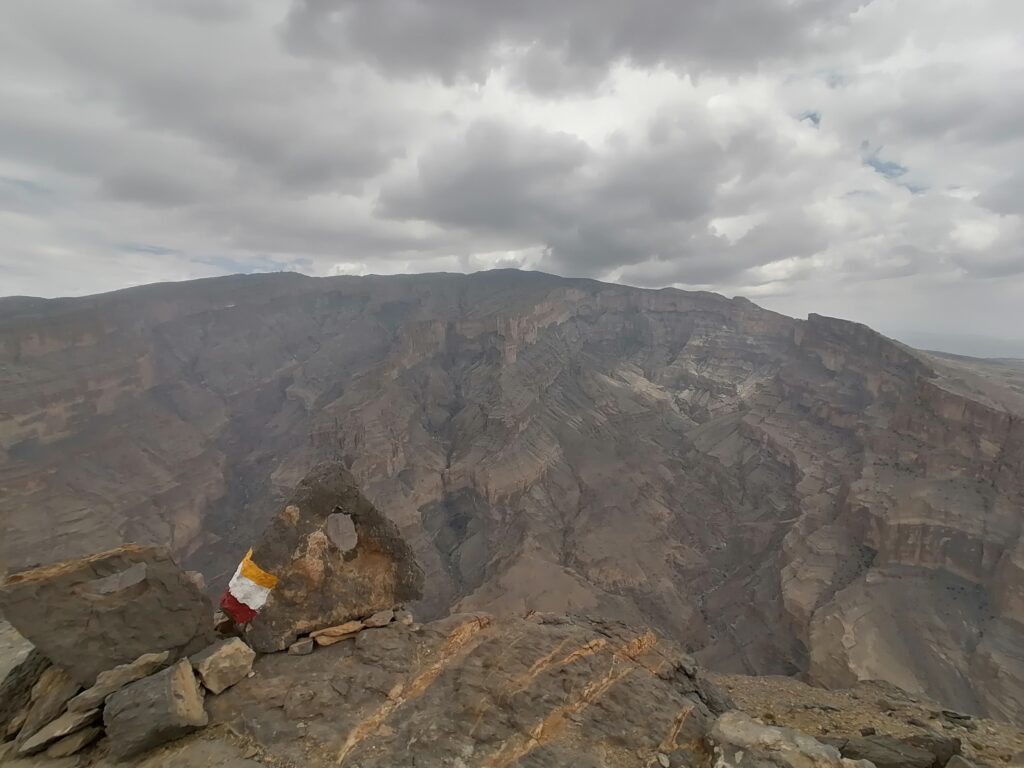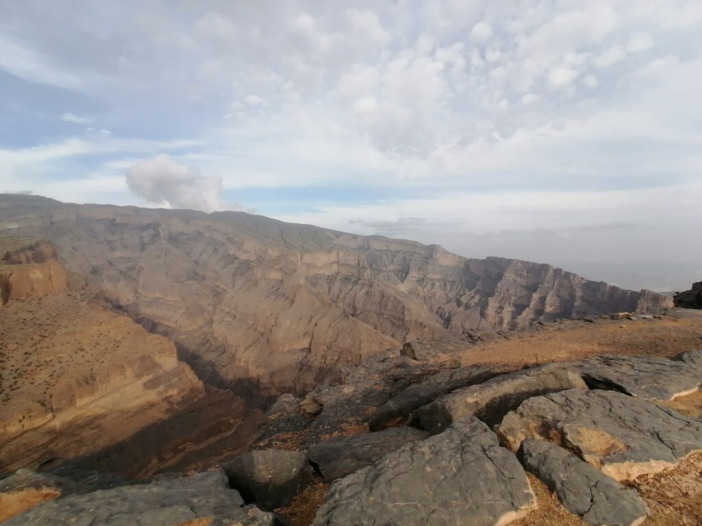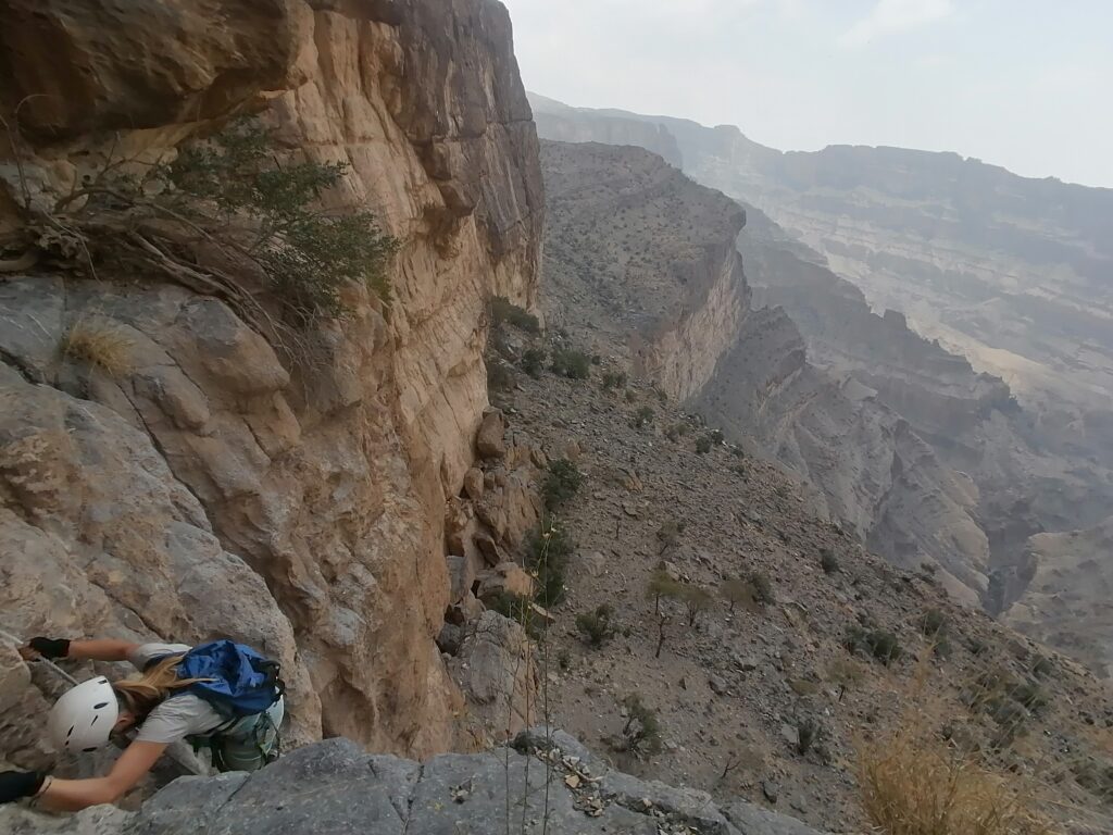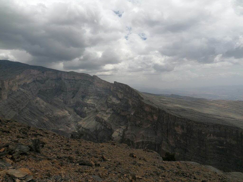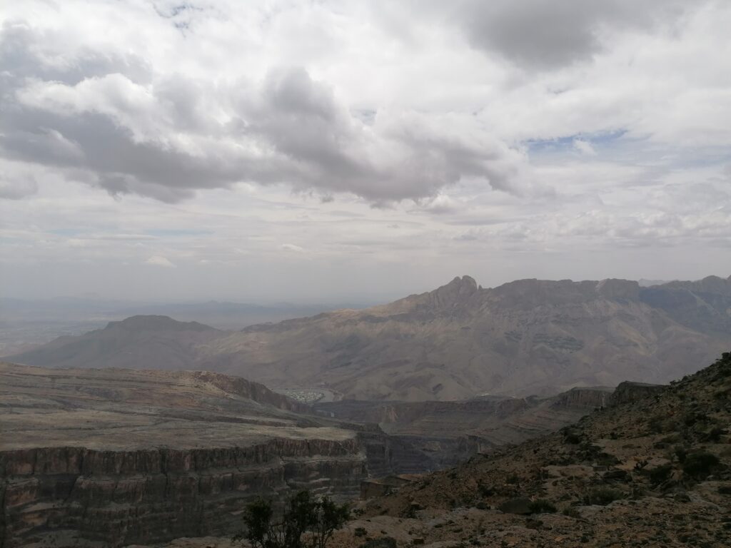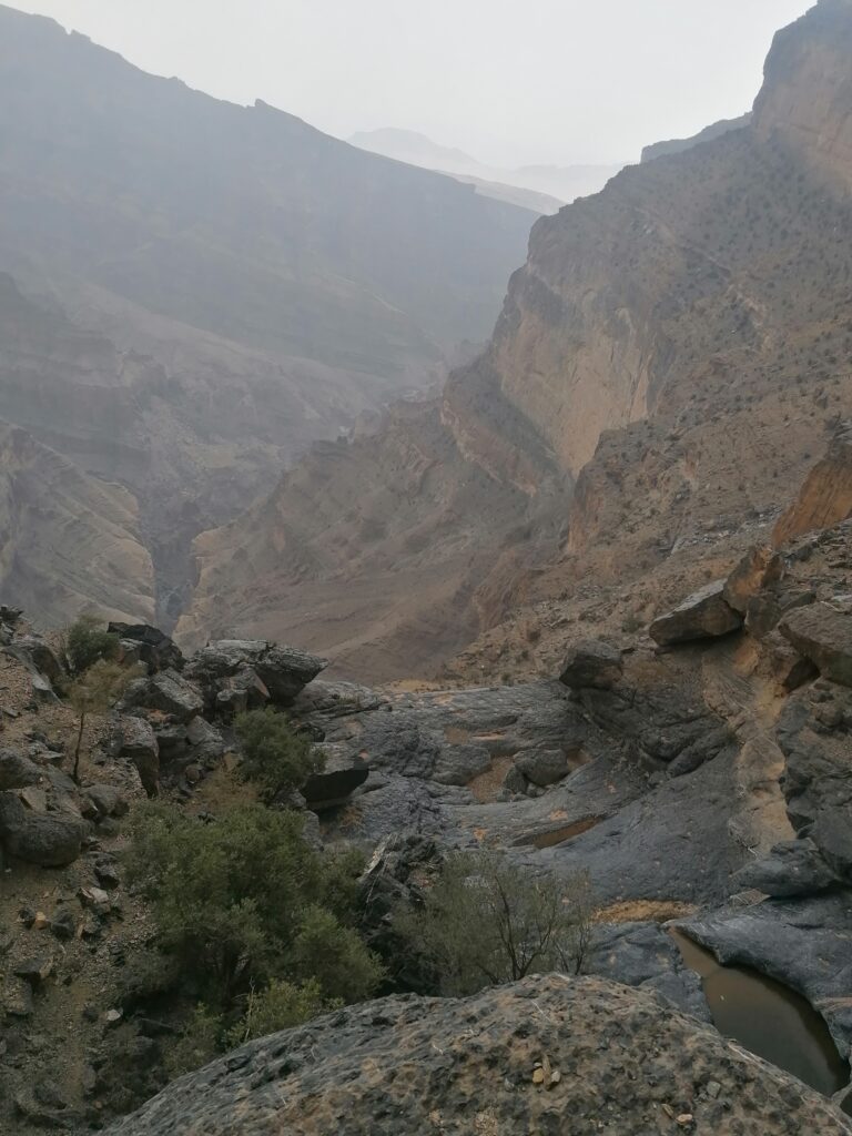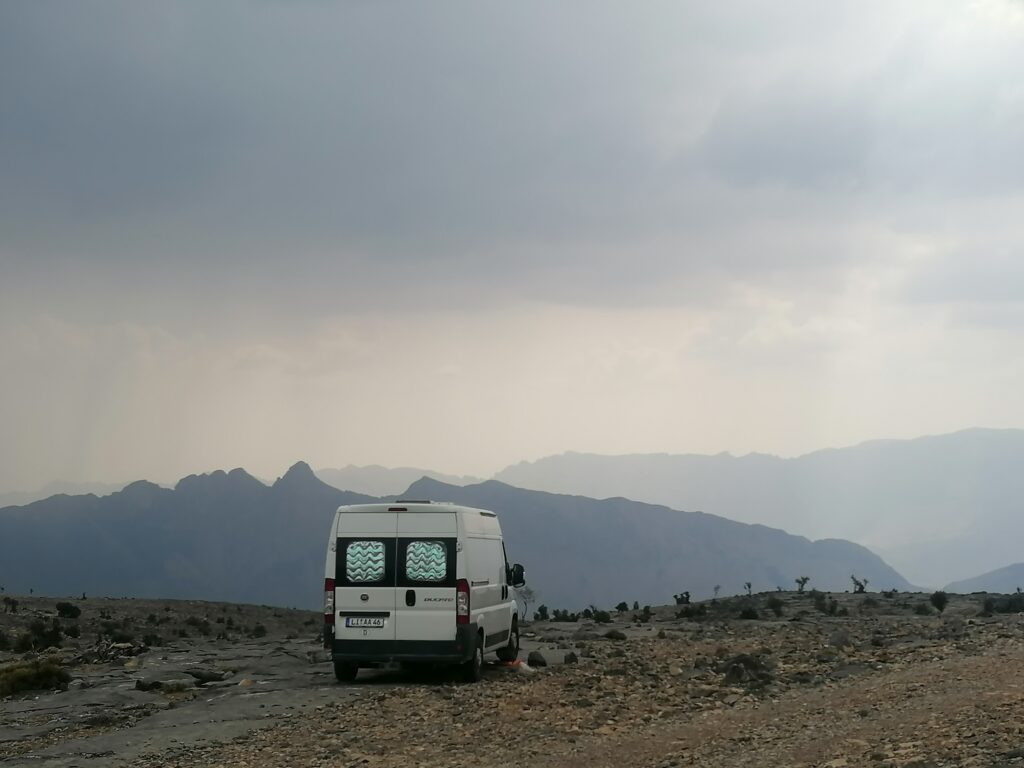 Anschließend geht es weiter in Richtung Jebel Shams dem höchsten Berg des Oman. Noch einmal mühen wir LIAA eine Bergpiste hinauf. Dieses Mal jedoch mit Empfehlung von Omani sowie einer uns im Mini-PKW von oben entgegenkommenden deutschen Familie. Oben angekommen genießen wir herrliche Aussichten über den “Grand Canyon des Oman” sowie sehr angenehme ~20°C und super Internet Empfang. Wir bleiben also ein paar Tage um uns von der Hitze in den Tälern zu erholen. Von unserem Standplatz startet der “Balcony Walk” eine Wanderung entlang der Schluchten des Jebel Shams. Im letzten Augenblick entdecken wir, dass dieser über einen Klettersteig auch als Rundwanderung begangen werden kann und packen unsere Klettersteigausrüstung mit ein. Die Absicherung sieht hochwertig aus, fast besser als in den Dolomiten und so steigen wir auch kurzerhand in den Steig ein. Ein super Abschluss für die Tour, wo wir keine anderen Touristen mehr treffen und noch einige Aussichten über die Schluchten genießen können. Glücklicherweise ist der Steig nicht besonders lang, auch weil nach ca 3/4 plötzlich Regen einsetzt. Es muss einer der 11 Regentage diesen Jahres sein -.-. Wir klettern zügig zum Ausstieg und kommen in einer Höhle unter, die wohl von den Dorfbewohnern der Gegend ausgebaut worden war. Eine kleine Gruppe Schafe, die uns über die Felsen entgegengeklettert kommt und wohl auch den Unterschlupf zum Ziel hatte, zieht als sie uns erblickt irritiert weiter die Schlucht hinab. Wir harren aus, bis sich plötzlich über Seitenkanäle Sturzbäche ergießen, die wohl sich wohl aus dem Regenwasser gebildet hatten. Zum Glück sind wir so hoch und nicht in irgendeinem Wadi, in dem jetzt Sturzflutgefahr bestünde überlegen wir noch während wir die letzten Schritte auf die Hochebene und letztlich zu unserem Standplatz zurückgehen.