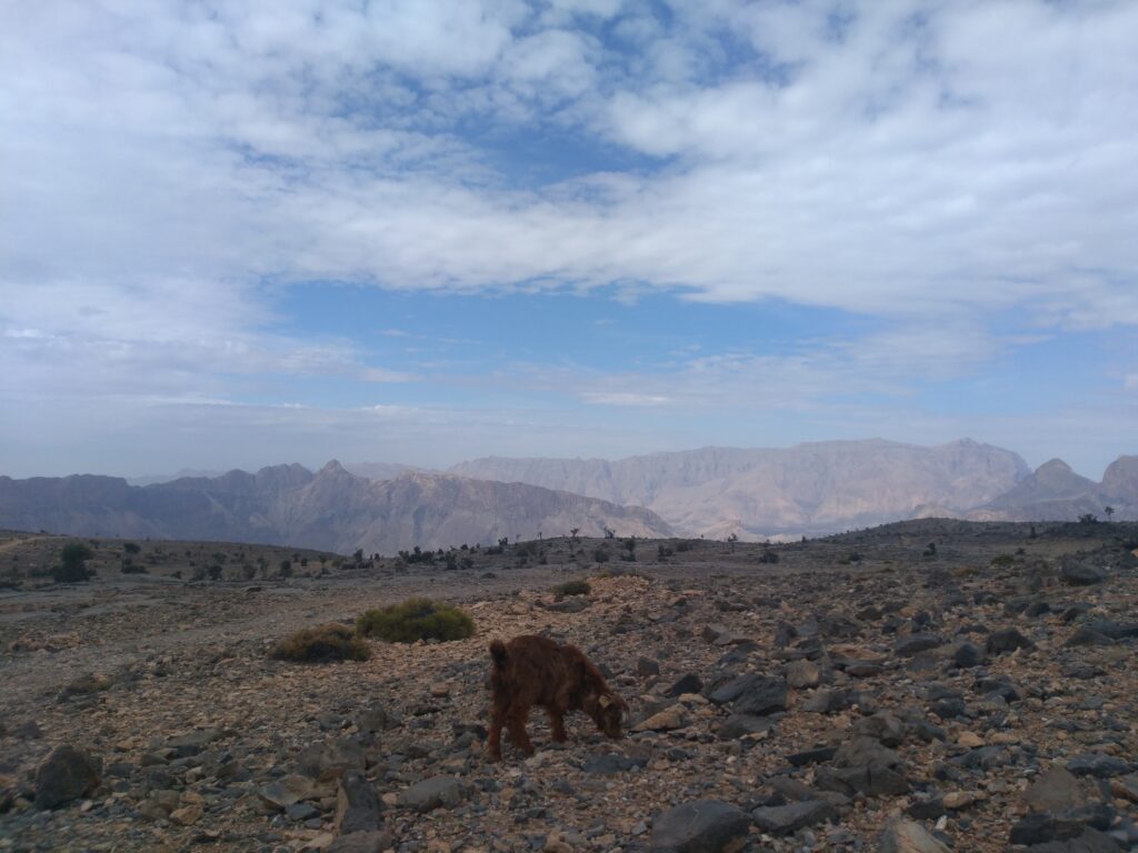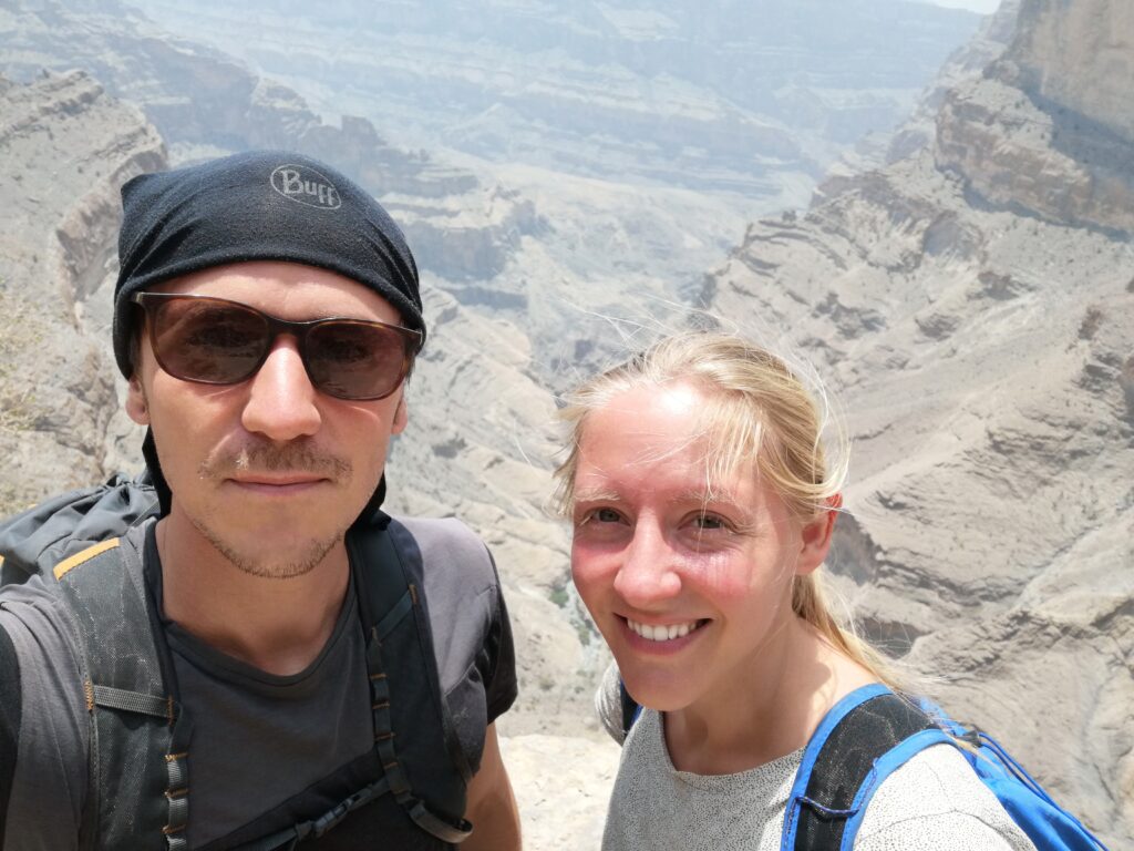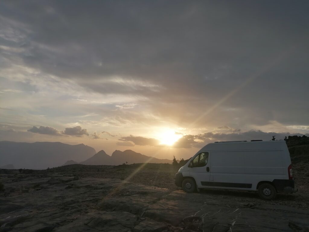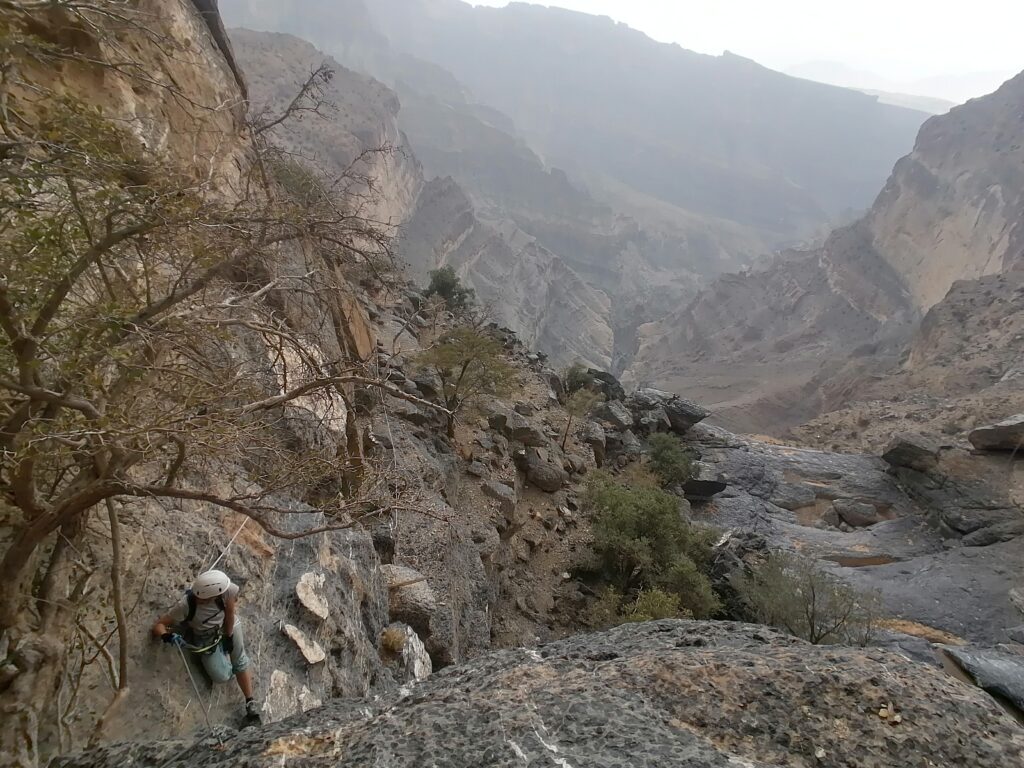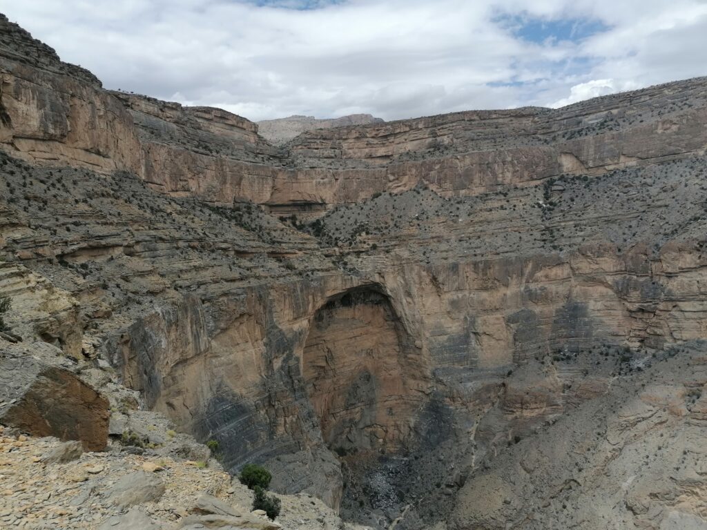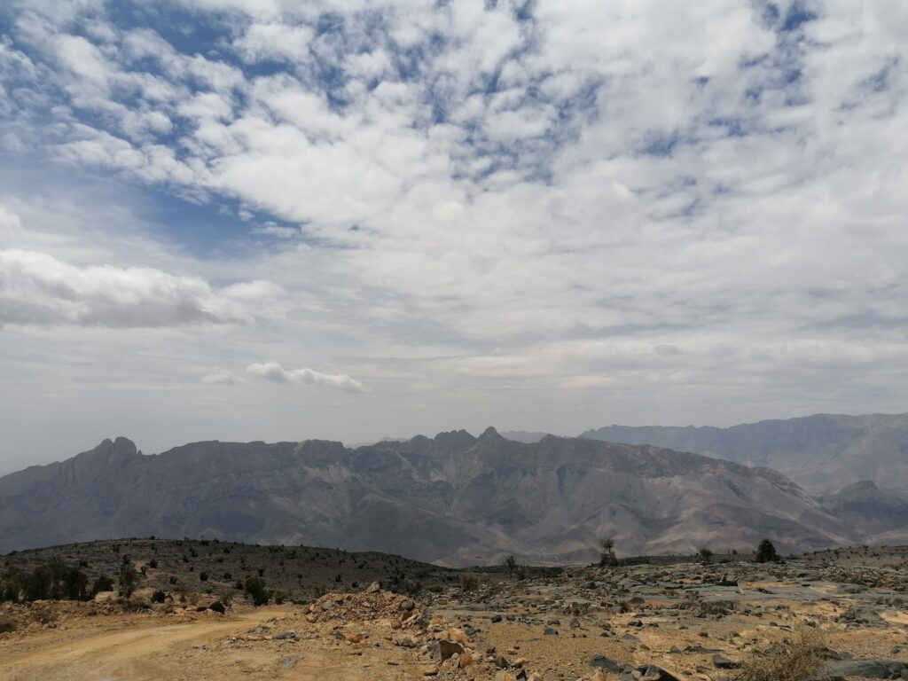 Anschließend geht es weiter in Richtung Jebel Shams dem höchsten Berg des Oman. Noch einmal mühen wir LIAA eine Bergpiste hinauf. Dieses Mal jedoch mit Empfehlung von Omani sowie einer uns im Mini-PKW von oben entgegenkommenden deutschen Familie. Oben angekommen genießen wir herrliche Aussichten über den “Grand Canyon des Oman” sowie sehr angenehme ~20°C und super Internet Empfang. Wir bleiben also ein paar Tage um uns von der Hitze in den Tälern zu erholen. Von unserem Standplatz startet der “Balcony Walk” eine Wanderung entlang der Schluchten des Jebel Shams. Im letzten Augenblick entdecken wir, dass dieser über einen Klettersteig auch als Rundwanderung begangen werden kann und packen unsere Klettersteigausrüstung mit ein. Die Absicherung sieht hochwertig aus, fast besser als in den Dolomiten und so steigen wir auch kurzerhand in den Steig ein. Ein super Abschluss für die Tour, wo wir keine anderen Touristen mehr treffen und noch einige Aussichten über die Schluchten genießen können. Glücklicherweise ist der Steig nicht besonders lang, auch weil nach ca 3/4 plötzlich Regen einsetzt. Es muss einer der 11 Regentage diesen Jahres sein -.-. Wir klettern zügig zum Ausstieg und kommen in einer Höhle unter, die wohl von den Dorfbewohnern der Gegend ausgebaut worden war. Eine kleine Gruppe Schafe, die uns über die Felsen entgegengeklettert kommt und wohl auch den Unterschlupf zum Ziel hatte, zieht als sie uns erblickt irritiert weiter die Schlucht hinab. Wir harren aus, bis sich plötzlich über Seitenkanäle Sturzbäche ergießen, die wohl sich wohl aus dem Regenwasser gebildet hatten. Zum Glück sind wir so hoch und nicht in irgendeinem Wadi, in dem jetzt Sturzflutgefahr bestünde überlegen wir noch während wir die letzten Schritte auf die Hochebene und letztlich zu unserem Standplatz zurückgehen.