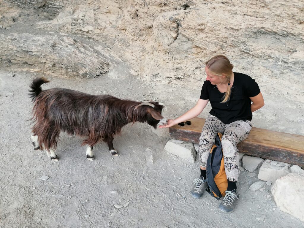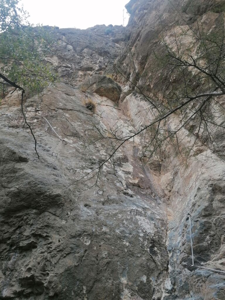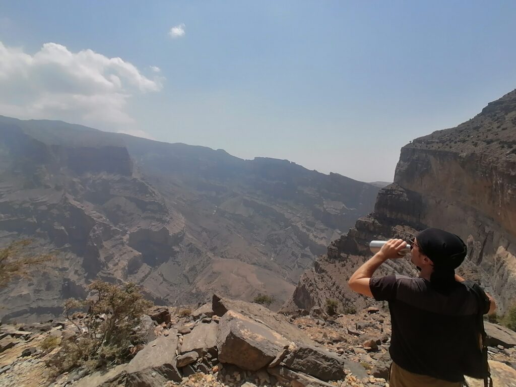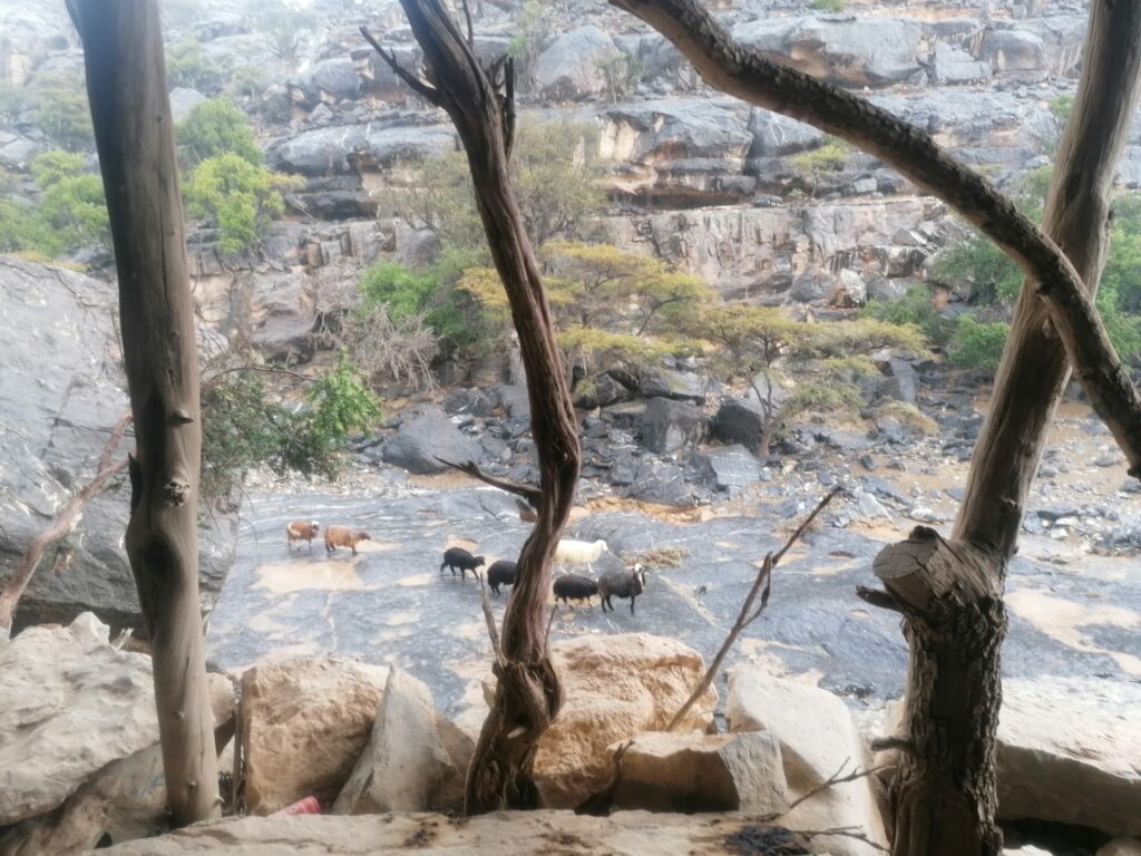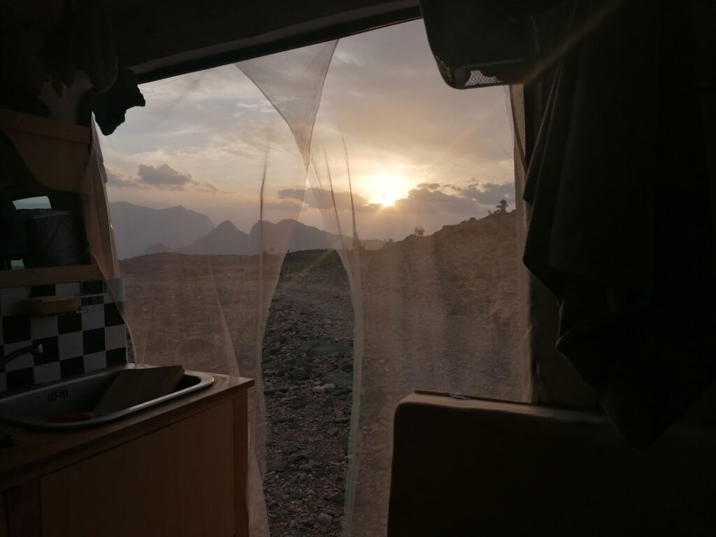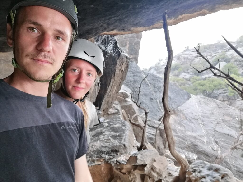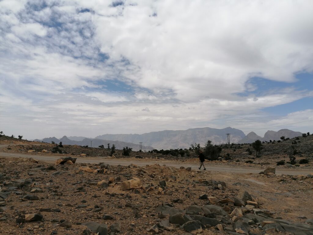Anschließend geht es weiter in Richtung Jebel Shams dem höchsten Berg des Oman. Noch einmal mühen wir LIAA eine Bergpiste hinauf. Dieses Mal jedoch mit Empfehlung von Omani sowie einer uns im Mini-PKW von oben entgegenkommenden deutschen Familie. Oben angekommen genießen wir herrliche Aussichten über den “Grand Canyon des Oman” sowie sehr angenehme ~20°C und super Internet Empfang. Wir bleiben also ein paar Tage um uns von der Hitze in den Tälern zu erholen. Von unserem Standplatz startet der “Balcony Walk” eine Wanderung entlang der Schluchten des Jebel Shams. Im letzten Augenblick entdecken wir, dass dieser über einen Klettersteig auch als Rundwanderung begangen werden kann und packen unsere Klettersteigausrüstung mit ein. Die Absicherung sieht hochwertig aus, fast besser als in den Dolomiten und so steigen wir auch kurzerhand in den Steig ein. Ein super Abschluss für die Tour, wo wir keine anderen Touristen mehr treffen und noch einige Aussichten über die Schluchten genießen können. Glücklicherweise ist der Steig nicht besonders lang, auch weil nach ca 3/4 plötzlich Regen einsetzt. Es muss einer der 11 Regentage diesen Jahres sein -.-. Wir klettern zügig zum Ausstieg und kommen in einer Höhle unter, die wohl von den Dorfbewohnern der Gegend ausgebaut worden war. Eine kleine Gruppe Schafe, die uns über die Felsen entgegengeklettert kommt und wohl auch den Unterschlupf zum Ziel hatte, zieht als sie uns erblickt irritiert weiter die Schlucht hinab. Wir harren aus, bis sich plötzlich über Seitenkanäle Sturzbäche ergießen, die wohl sich wohl aus dem Regenwasser gebildet hatten. Zum Glück sind wir so hoch und nicht in irgendeinem Wadi, in dem jetzt Sturzflutgefahr bestünde überlegen wir noch während wir die letzten Schritte auf die Hochebene und letztlich zu unserem Standplatz zurückgehen.