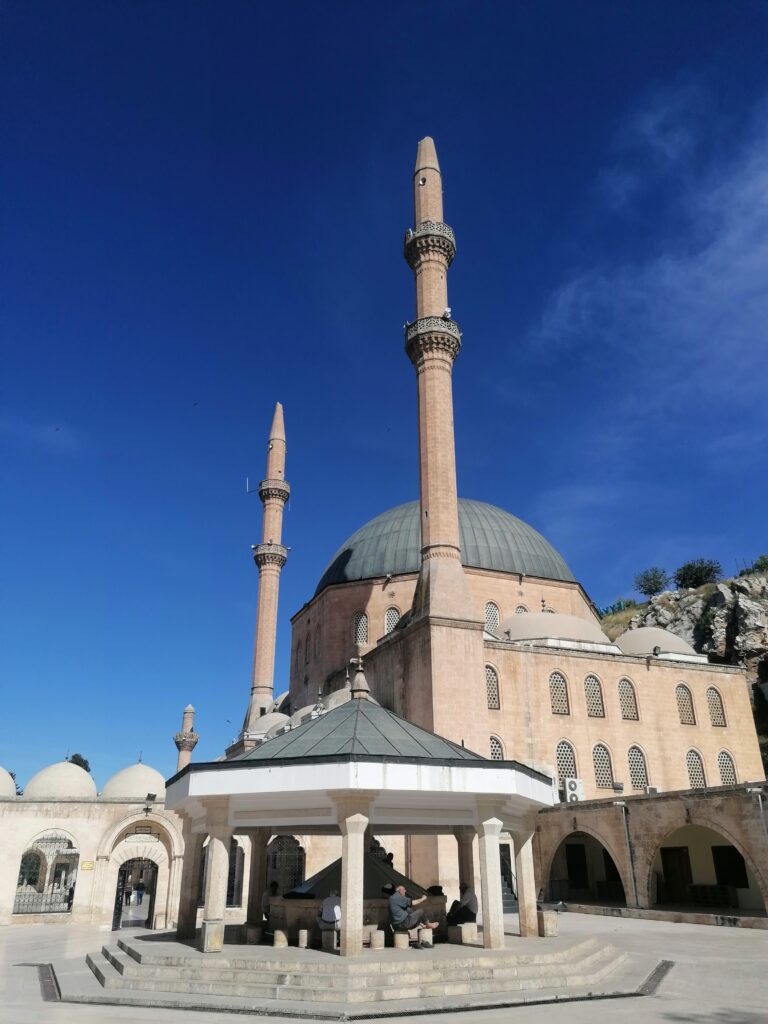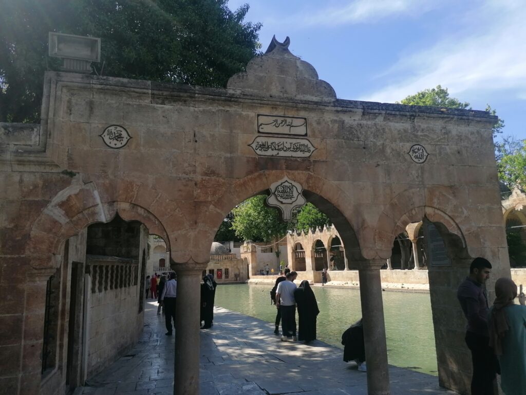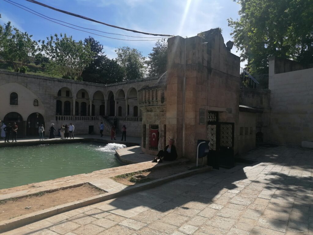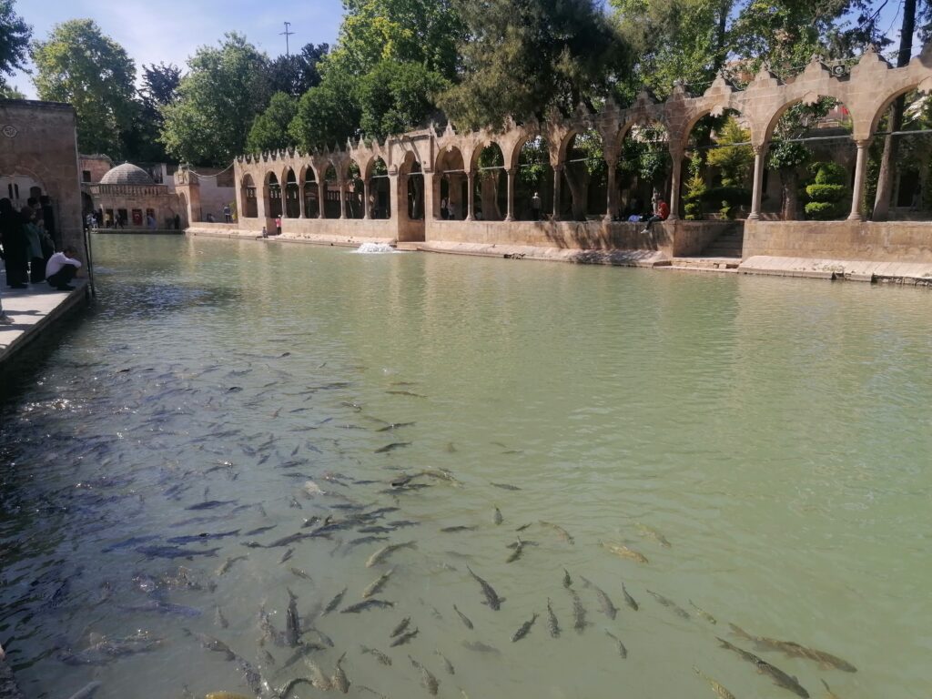 In Sanliurfa besuchen wir die 5. (?) heiligste Pilgerstädte des Islam. Hier soll Abraham ins Feuer geworfen worden sein. Gott / Allah verwandelte daraufhin das Feuer in Wasser und die Brennscheite in Fische, die sich bis heute zahlreich und durch die zahlreichen Pilger wohlgenährt in den Becken tummeln. Wir streunen durch die Stadt und in den Basar in eine Karawanserei bevor wir zu unserem Standplatz außerhalb zurückkehren. Als wir unweit von dort einem Kurden Starthilfe geben, werden wir natürlich prompt zum Essen eingeladen. Wir nehmen an und besuchen Keskinn und seine Familie zum Abendessen.