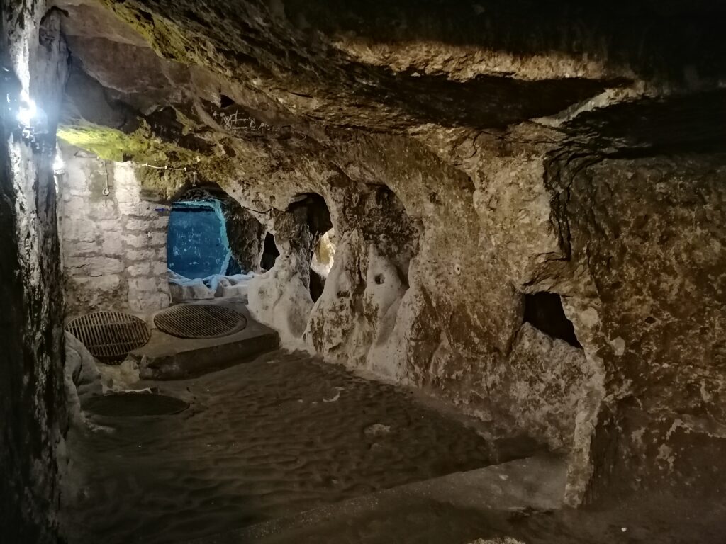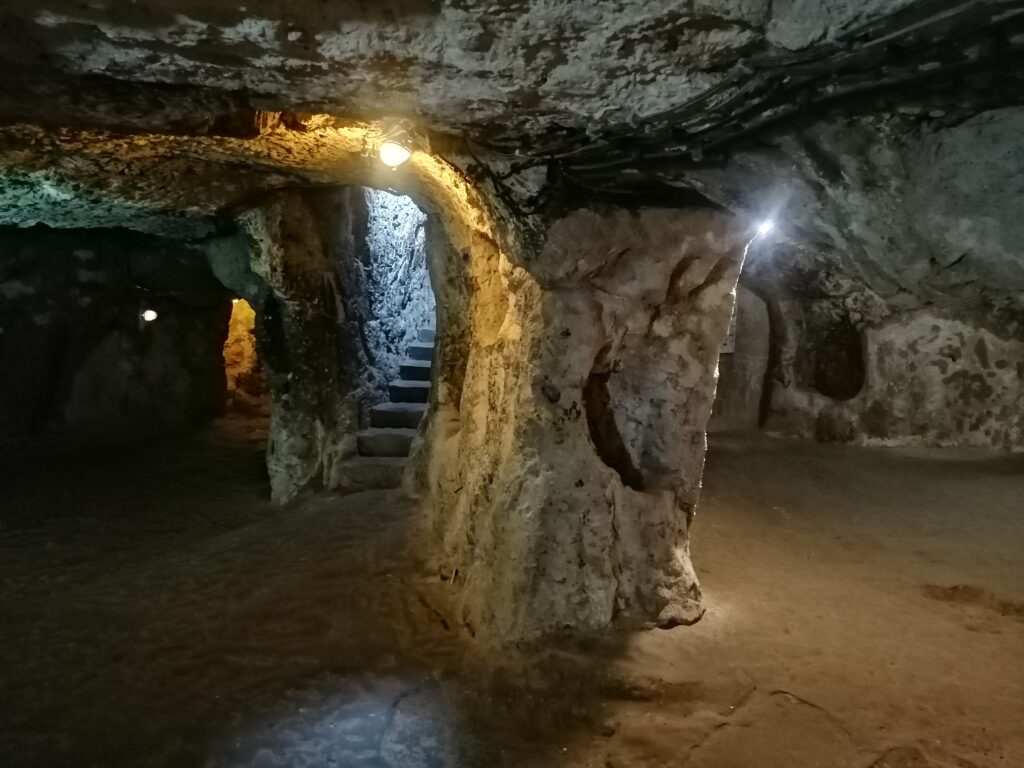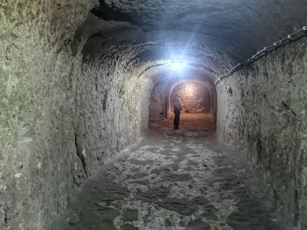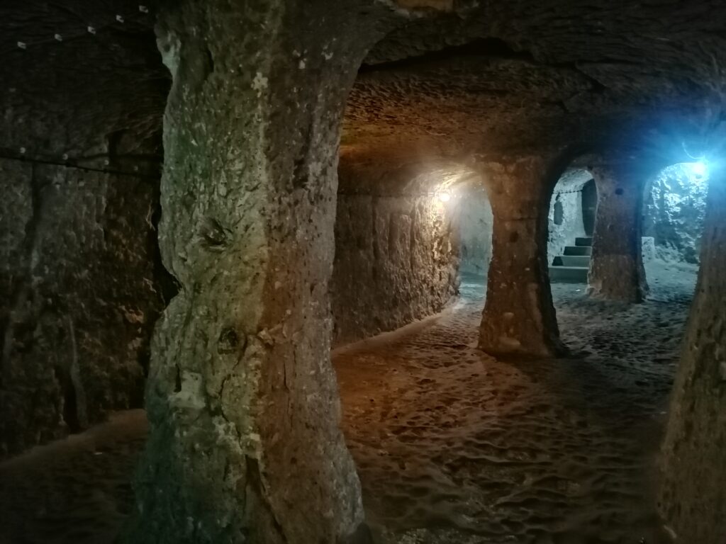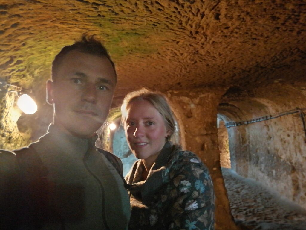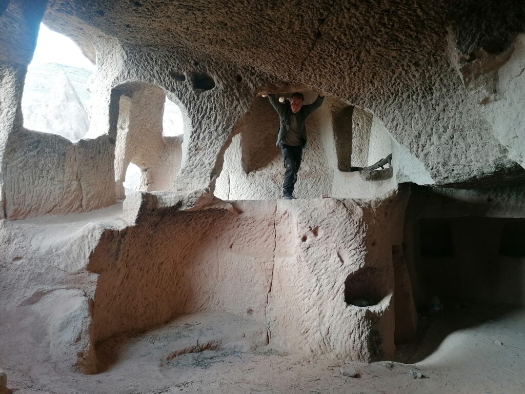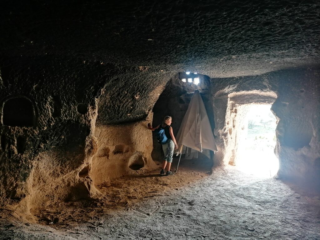 Es geht noch etwas weiter in Richtung Westen zu den berühmten Sandsteinbauten Kappadokiens. Bevor wir dort ankommen legen wir noch einen Zwischenstopp in Derinkuyu ein, wo sich eine alte unterirdische Höhlenstadt befindet. Bis zu 20 000 Menschen sollen in dieser Unterschlupf finden können. Für Besucher sind nur ca. 50 % überhaupt zugänglich und trotzdem kommen uns die, einem Ameisenbau gleichenden. Höhlengänge riesig vor.
