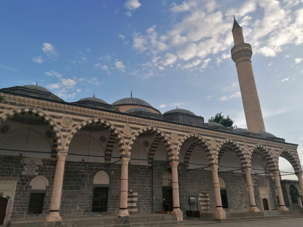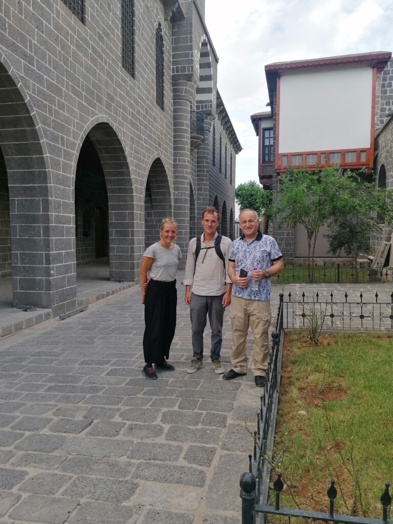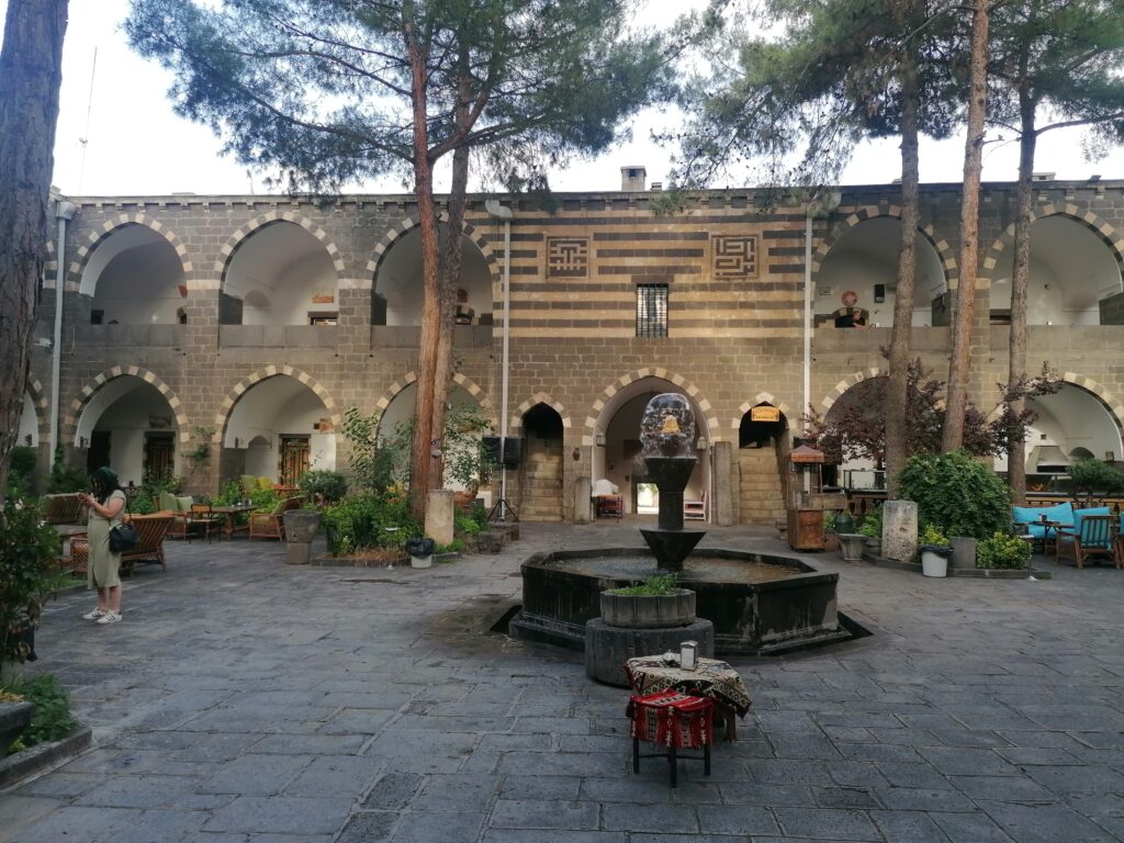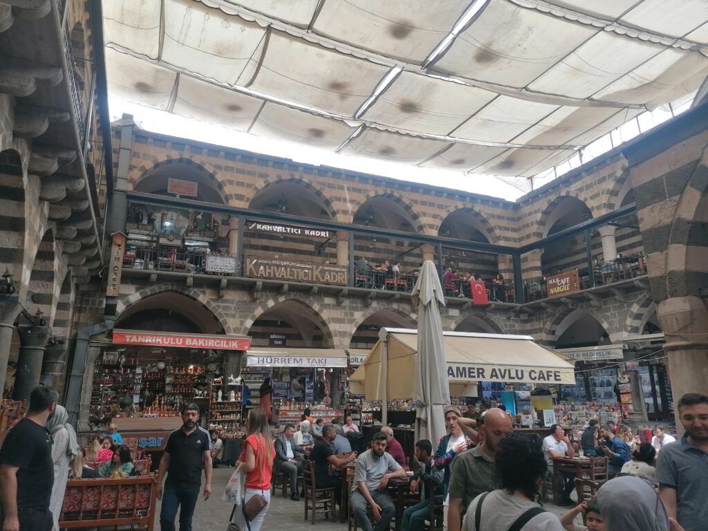 Am nächsten Morgen machten wir uns also auf Richtung Zentrum, bereits morgens war die historische Brücke über den Tigris von tanzenden und trommelnden Kurden besucht. Die ganze Stadt war von Erdogan Bildern und Flaggen geschmückt, die Hauptstraße bunt belebt. Wir fanden uns in einer alten Karawanserei ein und genossen einen Kurdischen Cafe, während wir einen Fremdenführer abwimmelten. Wir hatten schon so viel gesehen und wollten die Stadt gar nicht “besichtigen”, sondern gemütlich schlendern und das Flair genießen bzw. ein paar Dinge besorgen. Mit neuem Thermometer für den Wohnraum und Tupperboxen ausgestattet gönnten wir uns einen Ciger (Leber) Döner und wir müssen sagen, es war köstlich.