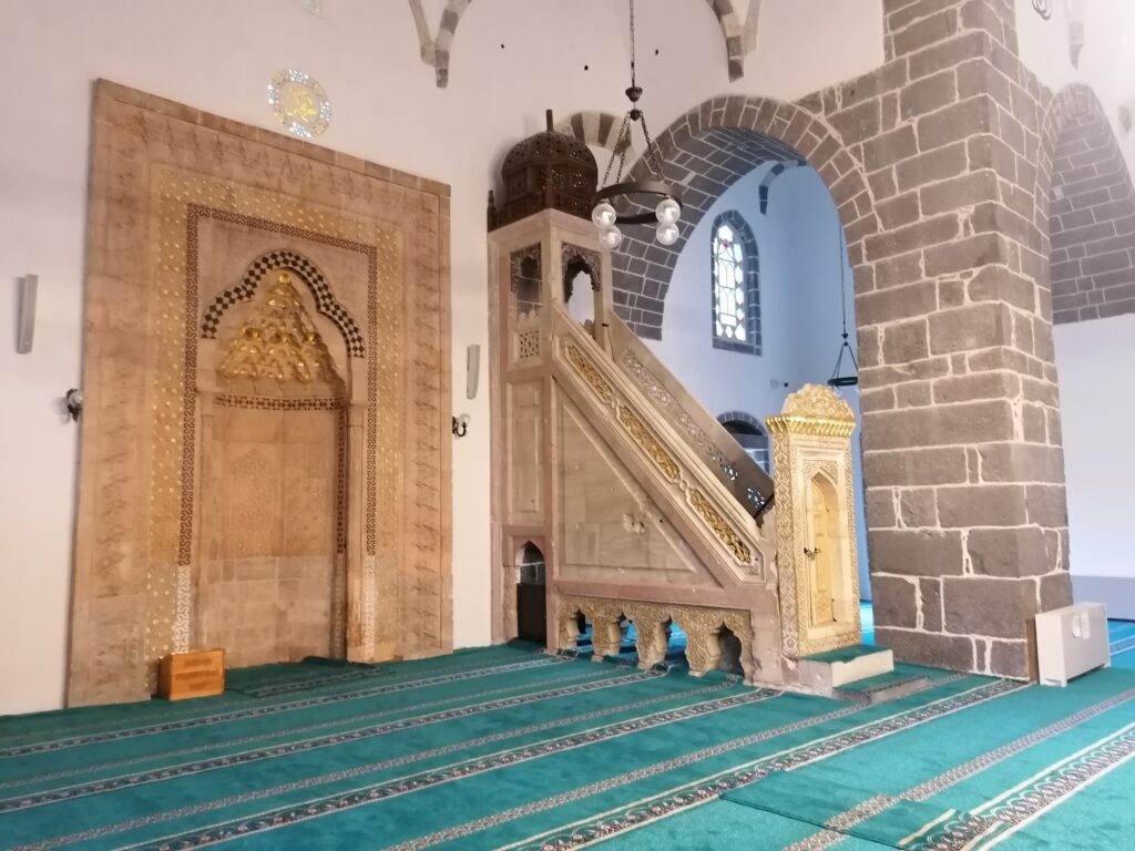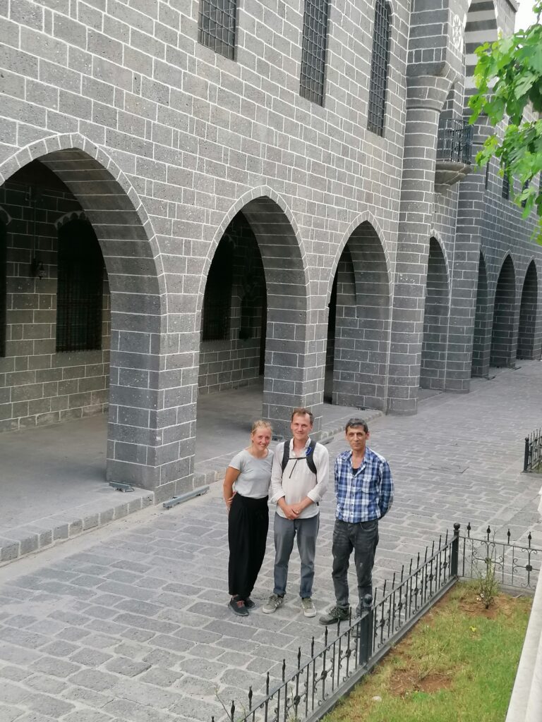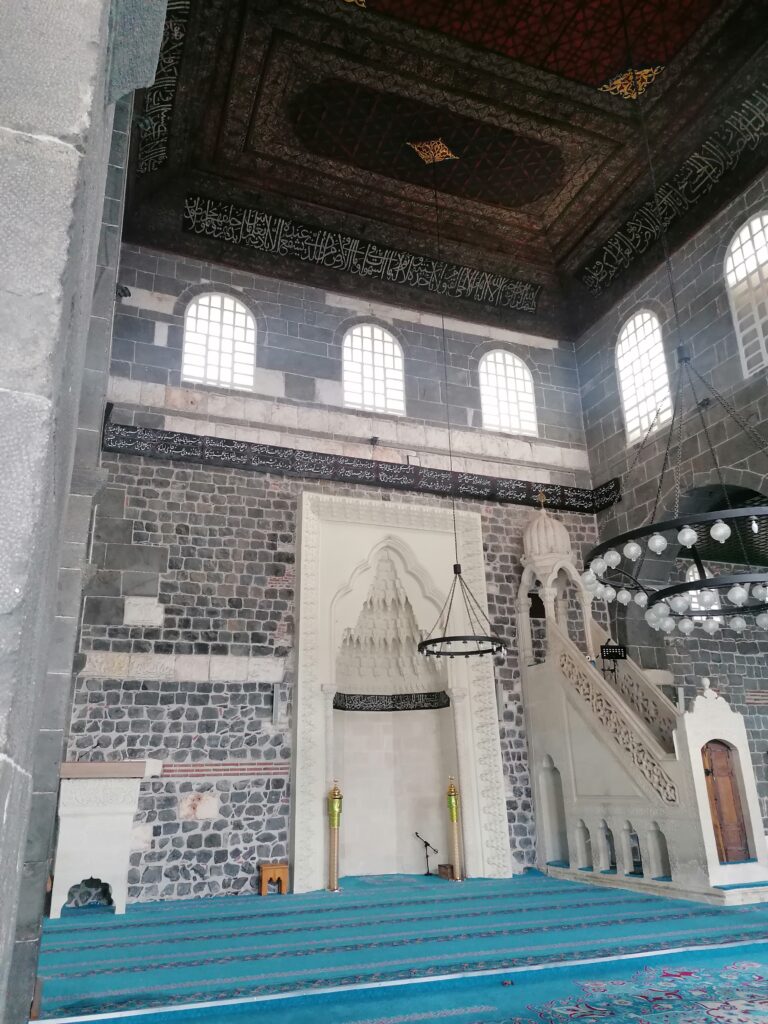 Nach einem kurzen Schlenk durch den Käsemarkt verging uns der Hunger und wir verzichteten dankend auf Milchprodukte und Oliven (obwohl diese Produkte bestimmt für eine ganz besonders gesunde Darmflora gesorgt hätten, vorausgestzt, man wäre nicht daran erkrankt) und als wir schon fast wieder aus dem Städchen draußen waren, wurden wir auf Deutsch angesprochen, von wo wir denn seien. Etwas zögerlich ließen wir uns zum Orangentee einladen, danach führen uns die zwei Kurden, die in Europa gearbeitet hatten, durch ihre Stadt. Man zeigte uns die Moschee mit Schusslöchern im Basalt, die von Auseinandersetzungen zwischen Kurden und Militär zeugten, die Stadtmauer, eine weitere Moschee, versorgte uns mit Simit und erzählte die teils traurige Geschichte der verwüsteten Stadt. Unsere Gastgeber spiegelten unterdessen die inneren Konflikte der Türkei wieder: einer von der Religion, die soviel Konflikt verursacht, abgewandt und dennoch ständig mit Gebetskette in der Hand, der andere aktiv muslimisch gläubig und in jeder der Moscheen betend; beide in Angst vor dem radikalen Islam, der sich in der Türkei ausbreite. Die Erdoganbilder seien übrigens absolut nicht von den Kurden gewünscht. Man habe sie dort, wie auch an anderen Orten als Propaganda einfach aufgehängt, der Wahlausgang wird bedauert.