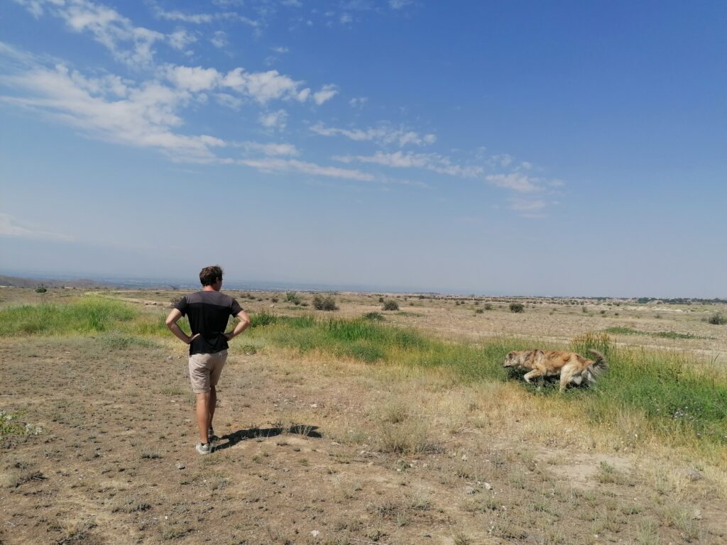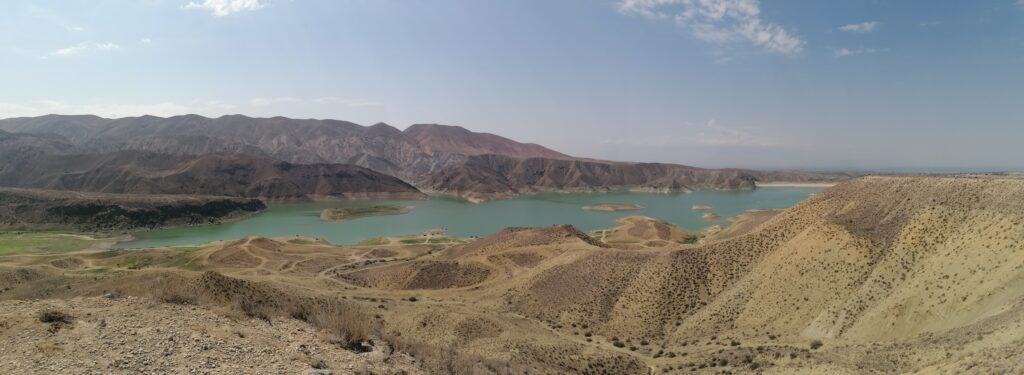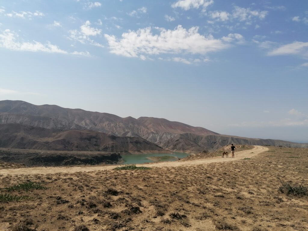 Am Azat Reservoir stehen wir für eine Nacht und haben natürliche prompt wieder vierbeinige Begleitung. Der riesige, verzottelte Mischung wirkt einschüchterend, will aber in erster Linie spielen und sabbert einen gerne mal voll. Farblich passt er wunderbar in diese wüstern- / steppenartige Landschaft.