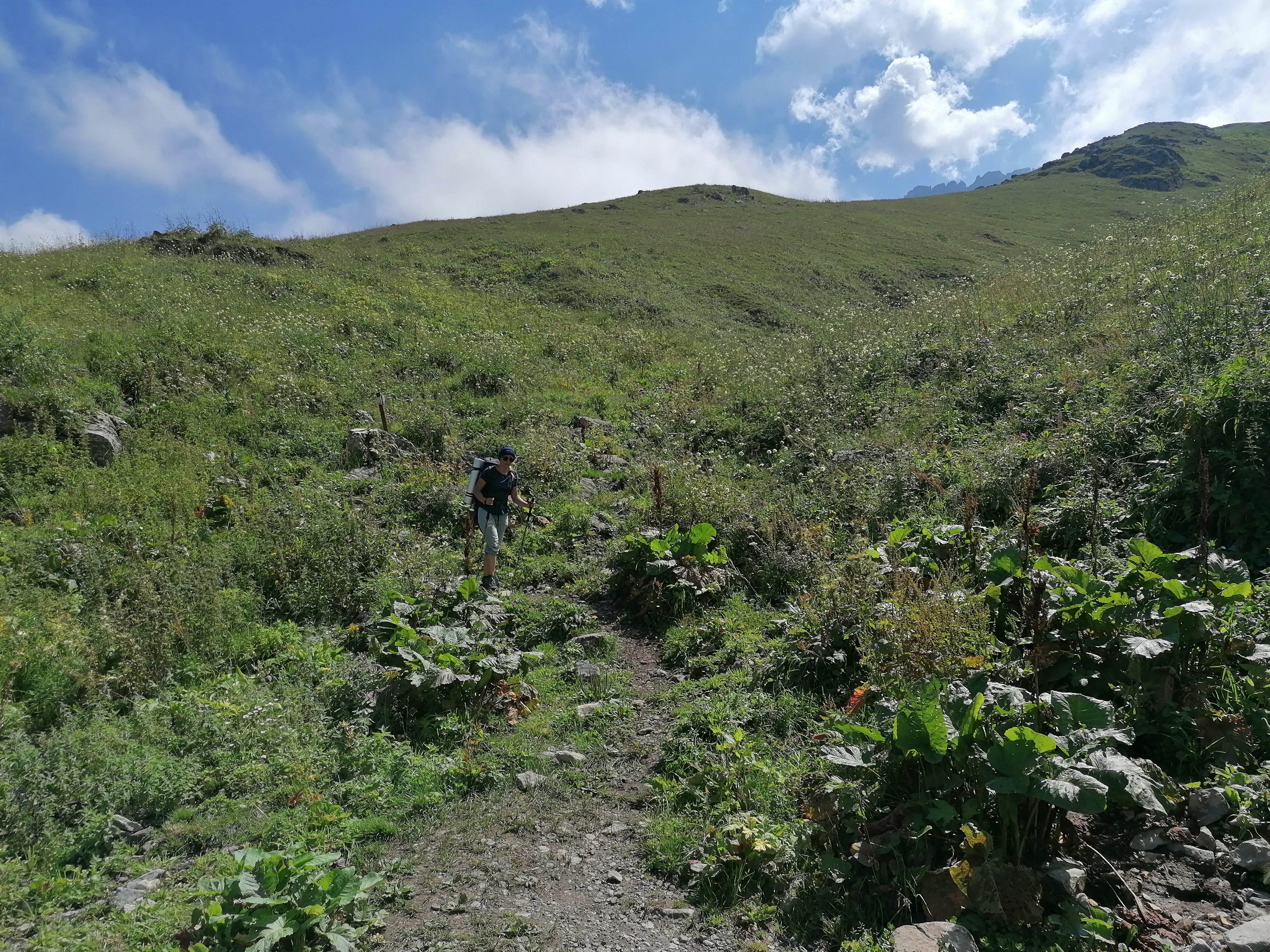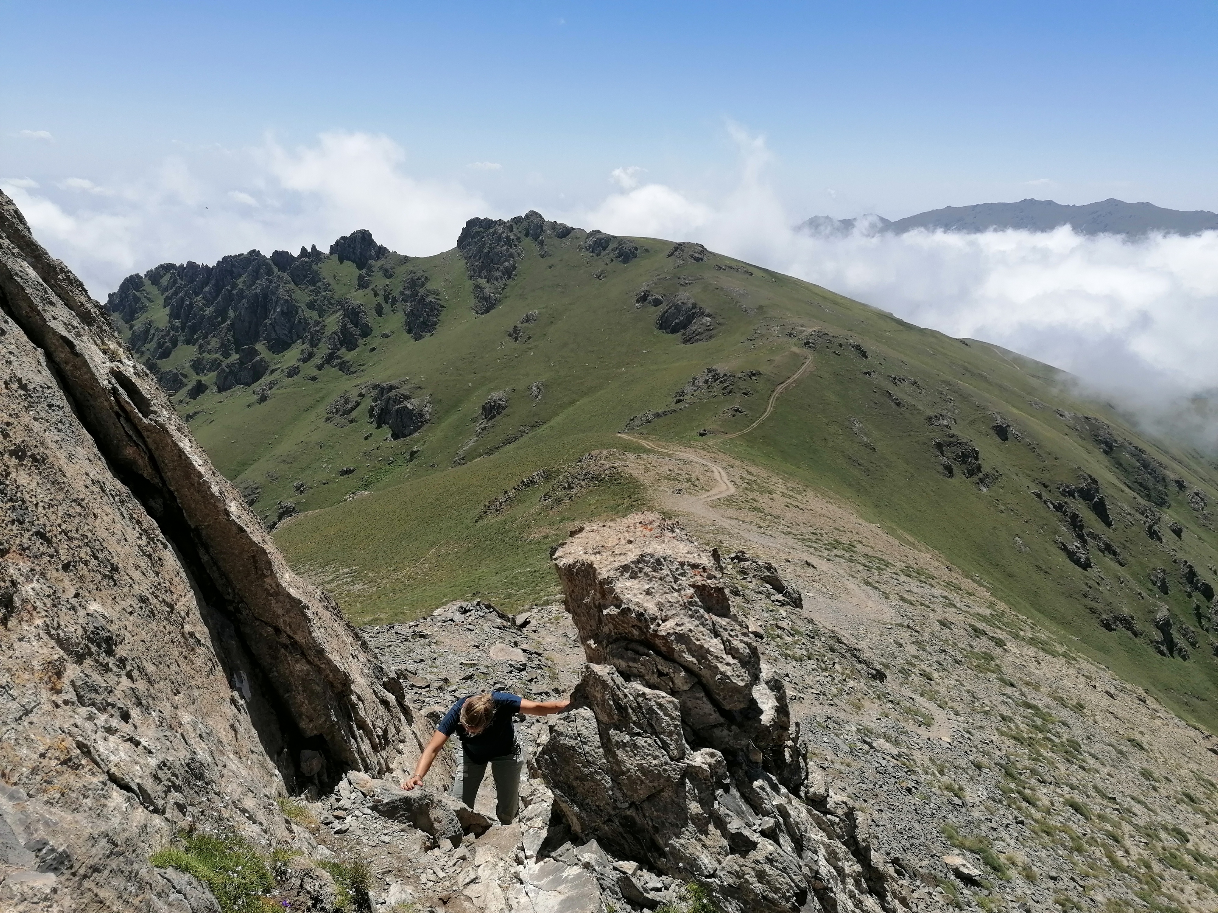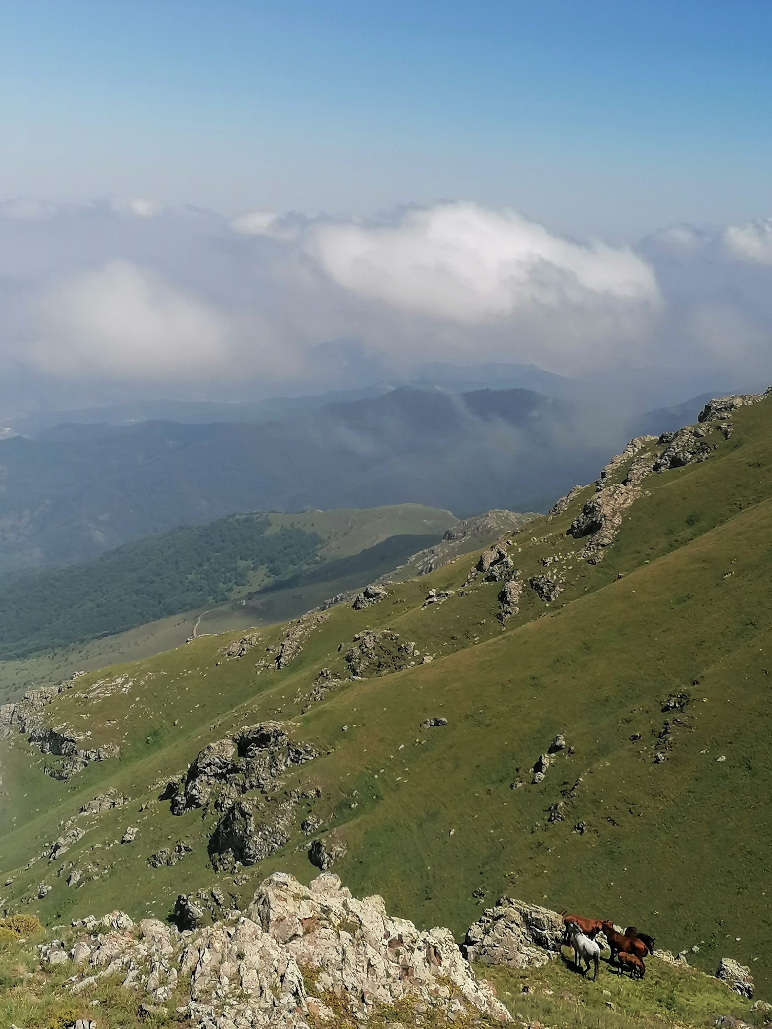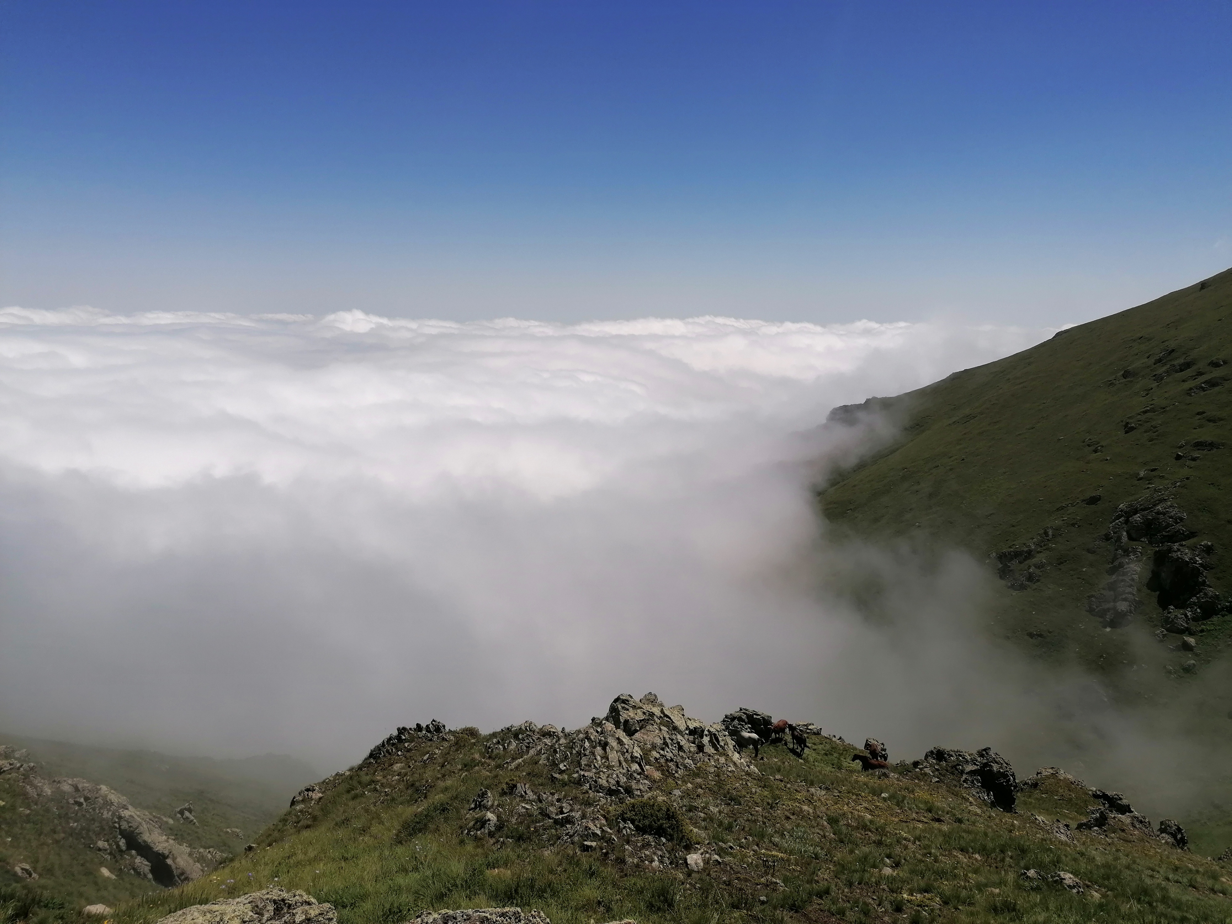 Es gibt kaum Bilder von Tag 1 und dem Zeltplatz, da der Aufstieg weitestgehend im Nebel stattfand. Erst an Tag 2 auf ca. 2800m brechen wir endlich durch die Wolkendecke durch und haben blauen Himmel über uns. Es erinnert uns sehr an die Alpen hier, mit Ausnahme der Gruppe Perde, die wir treffen und die sich wohl von der Hitze im Tal auf ca. 2500m zurückgezogen hat. Leider verdecken die Wolken den Blick vom Gipfel ins Tal trotzdem genießen wir die himmelähnliche Aussicht bevor wir wieder 2000 hm absteigen und zurück zum Auto gehen.