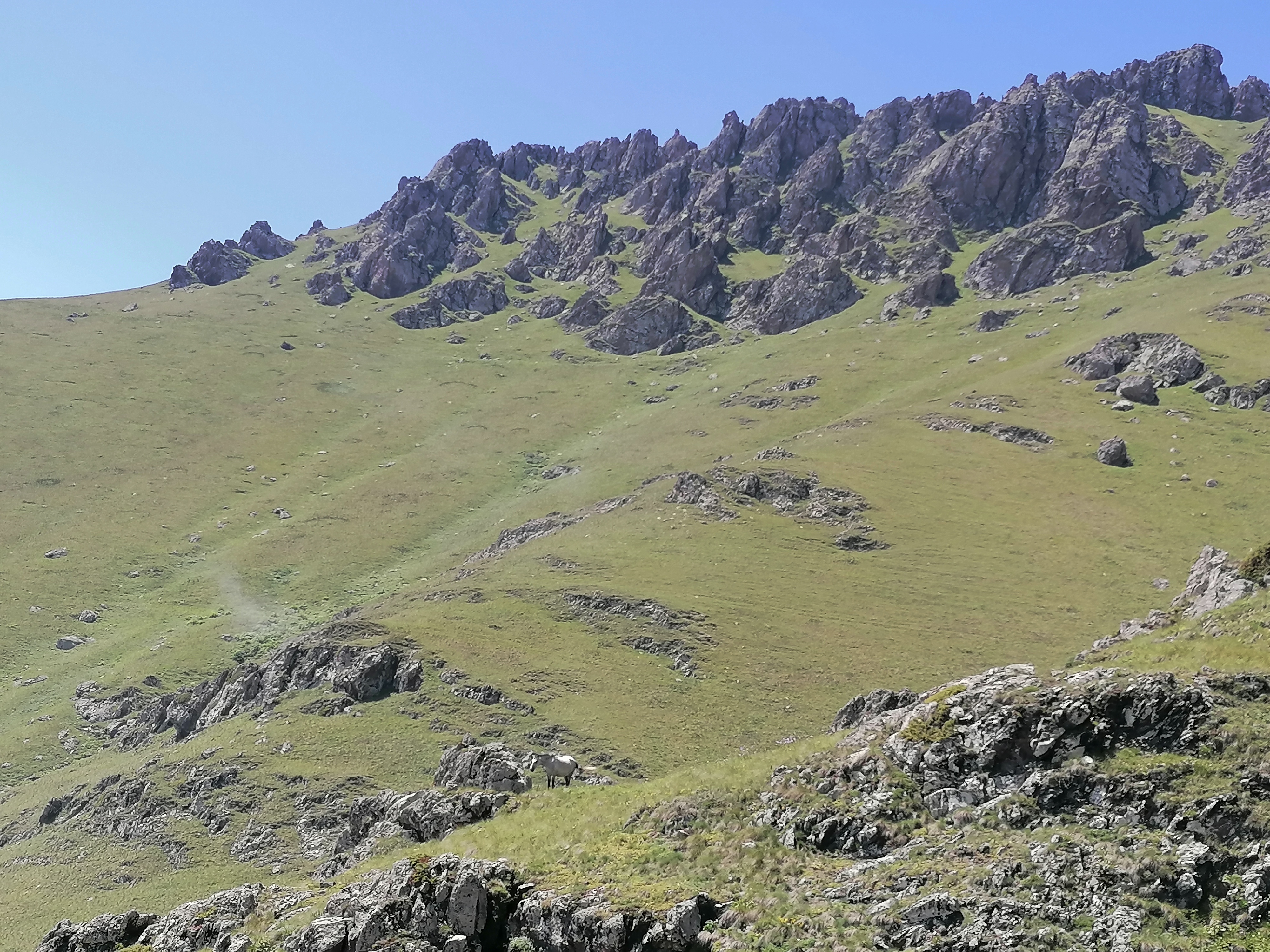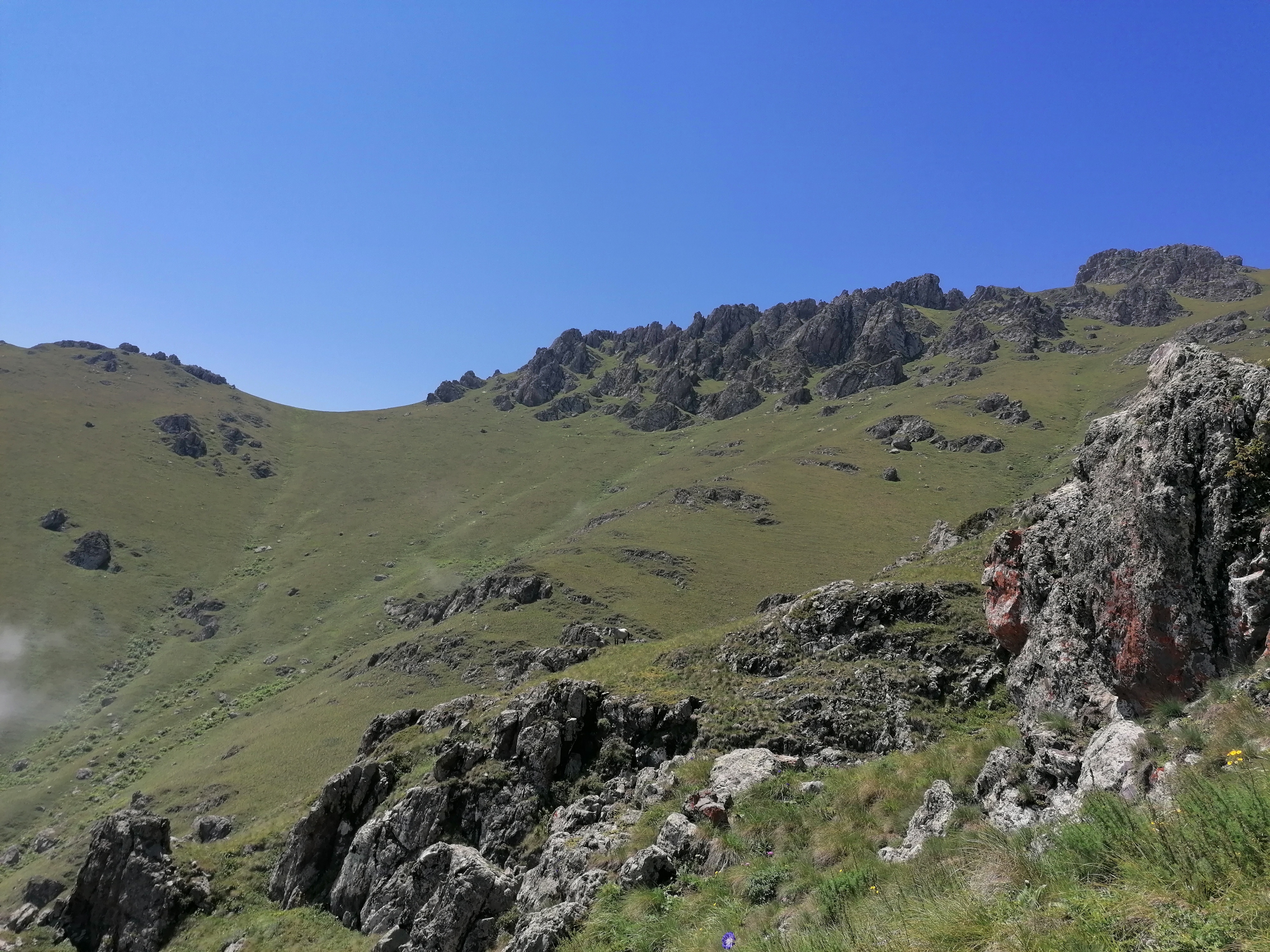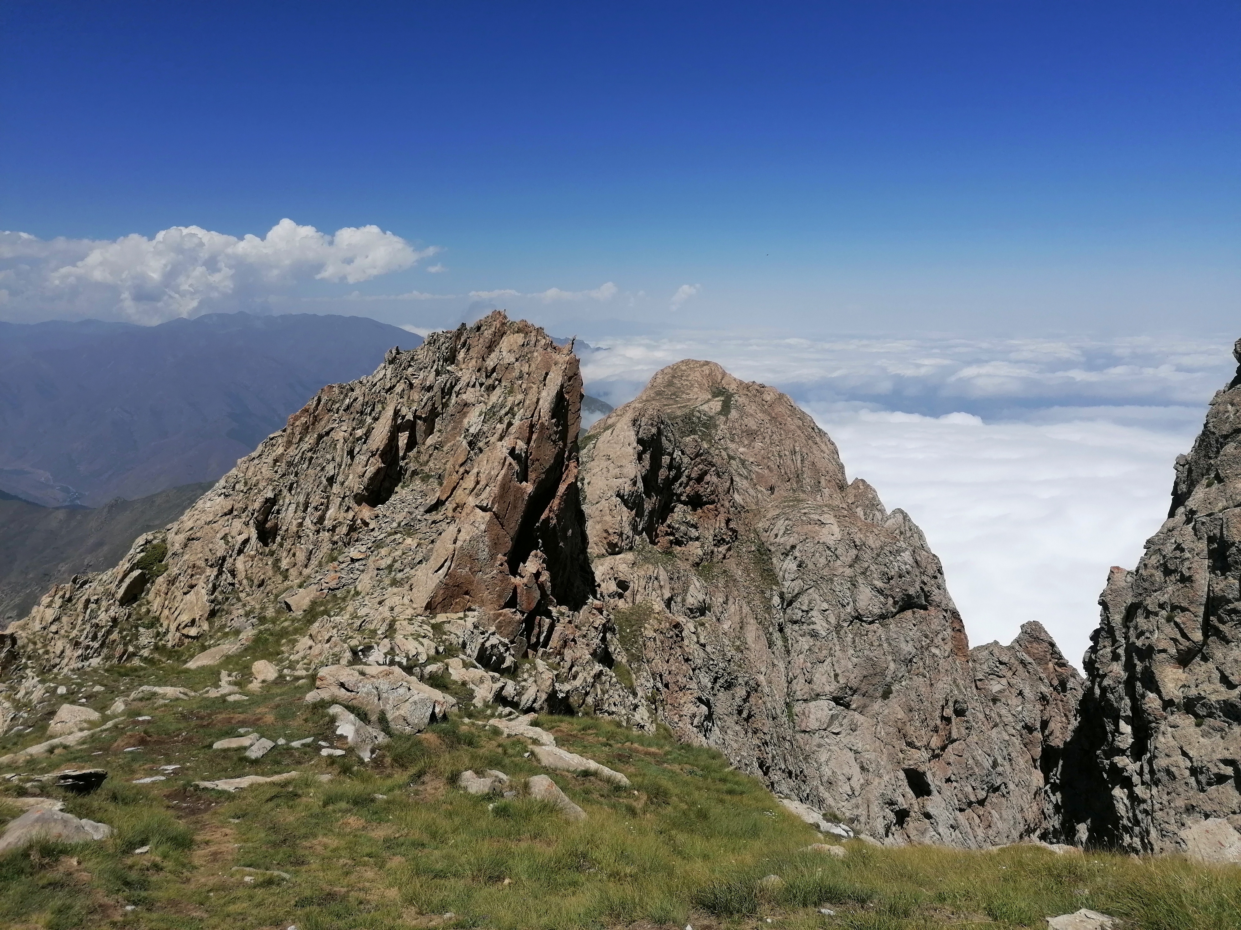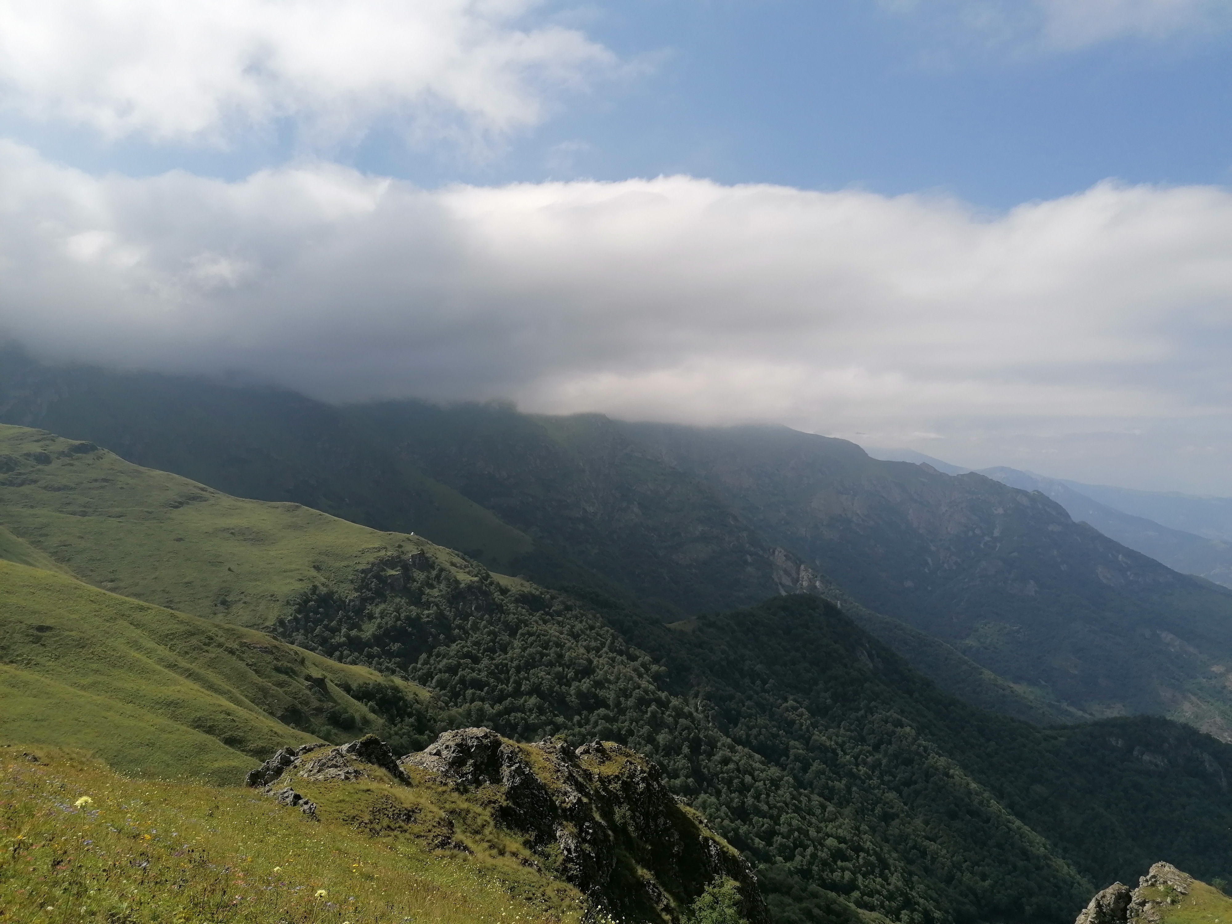 Es gibt kaum Bilder von Tag 1 und dem Zeltplatz, da der Aufstieg weitestgehend im Nebel stattfand. Erst an Tag 2 auf ca. 2800m brechen wir endlich durch die Wolkendecke durch und haben blauen Himmel über uns. Es erinnert uns sehr an die Alpen hier, mit Ausnahme der Gruppe Perde, die wir treffen und die sich wohl von der Hitze im Tal auf ca. 2500m zurückgezogen hat. Leider verdecken die Wolken den Blick vom Gipfel ins Tal trotzdem genießen wir die himmelähnliche Aussicht bevor wir wieder 2000 hm absteigen und zurück zum Auto gehen.