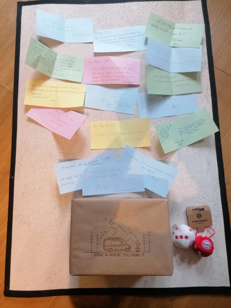 Reich beschenkt und gebührend verabschiedet verlassen wir Lindau. Der erste Abend beginnt bereits aufregend: Wir verbringen 3 Stunden auf der Suche nach meinem Geldbeutel, inklusive Führerschein, Personalausweis und allen Kreditkarten. Glücklicherweise finde ich ihn kurz vor 23 Uhr auf einem Stuhl in einem Besprechnungsraum meiner Arbeit.Anschließend kann uns nichts mehr aufhalten und wir verbringen die erste Nacht unserer Weltreise bei Leutkirch im Allgäu.