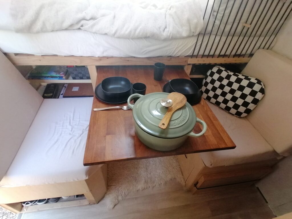 Hat man die Küche richtig verwendet kann man aus dem Bett den Esstisch herausziehen und mit 2-3 Personen gemütlich essen.