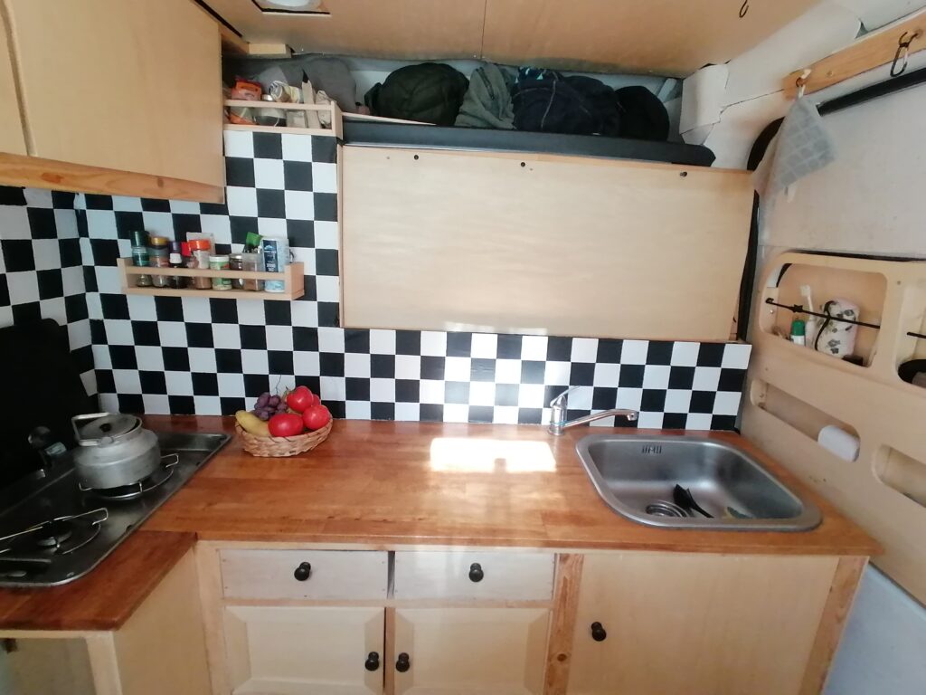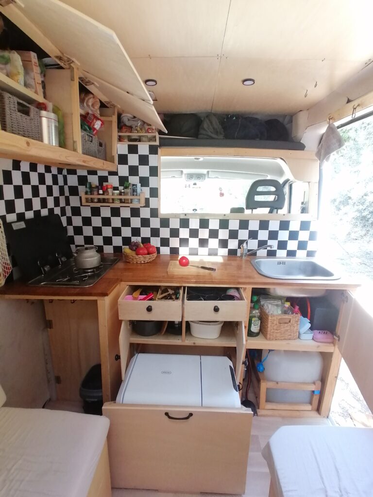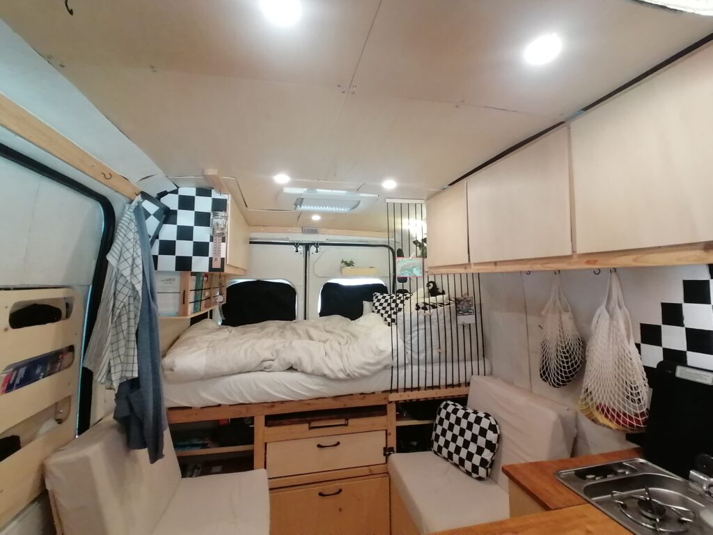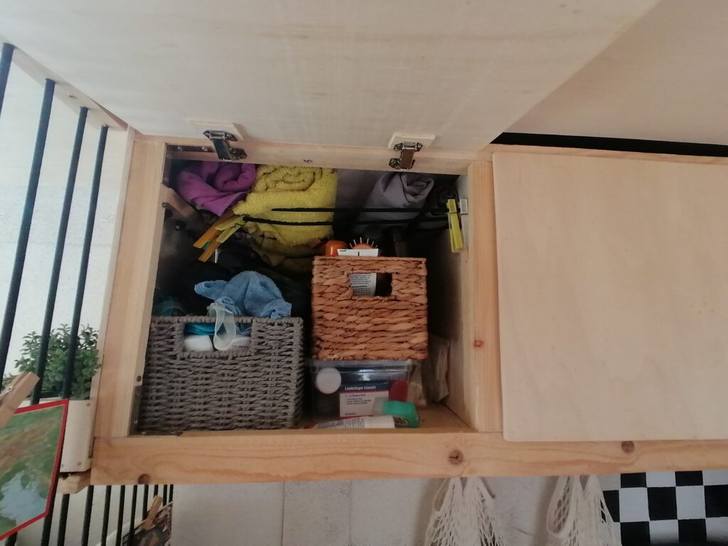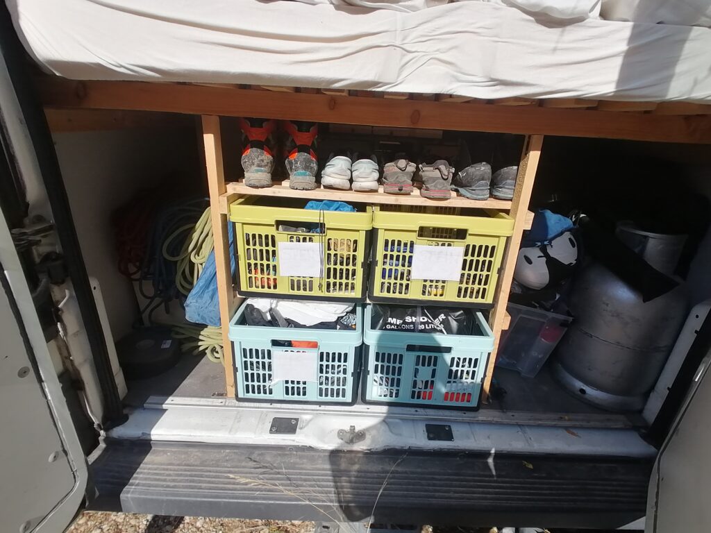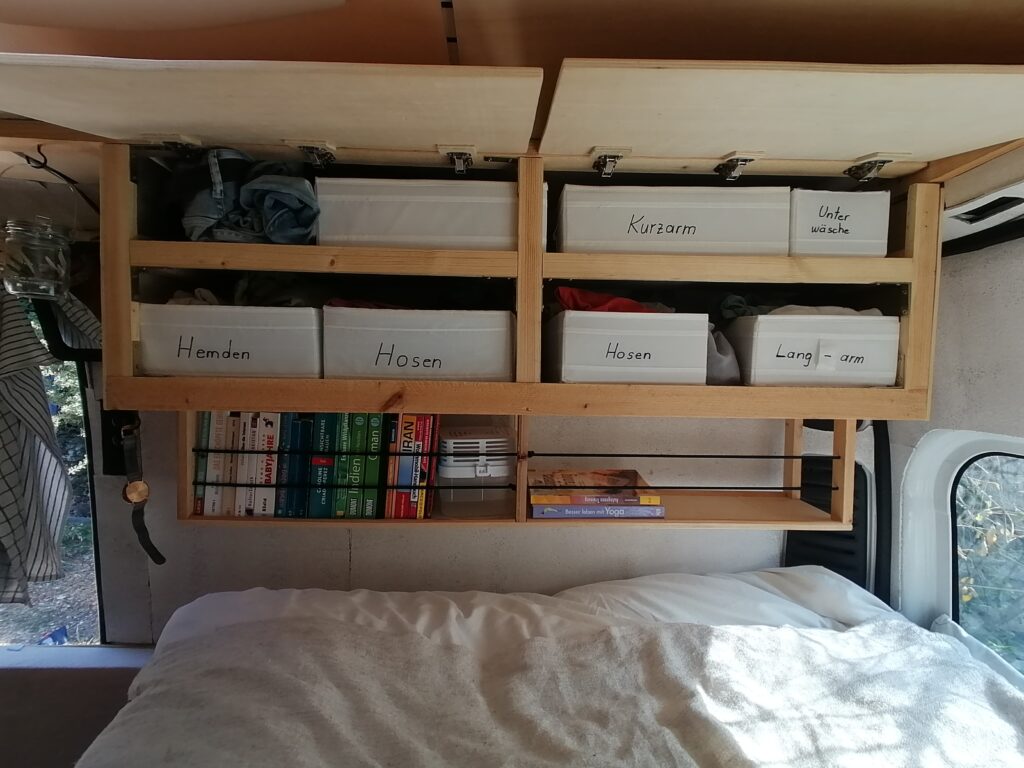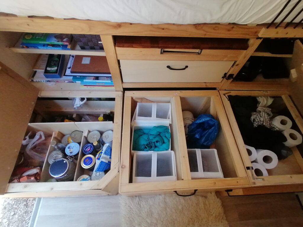 Unterhalb des Betts befindet sicher der Kofferraum mit allem, was man sonst noch so zum Vanlifen braucht.